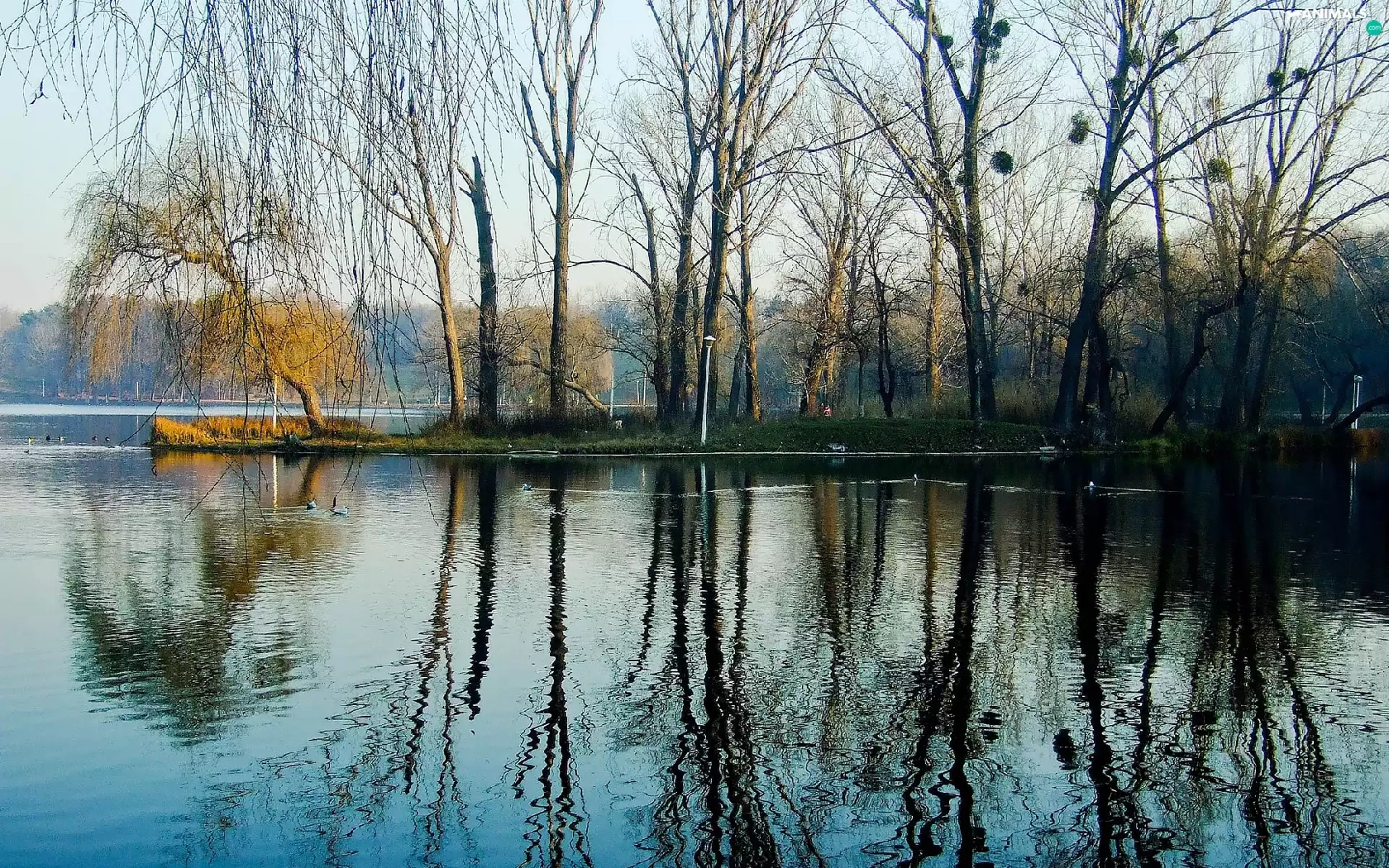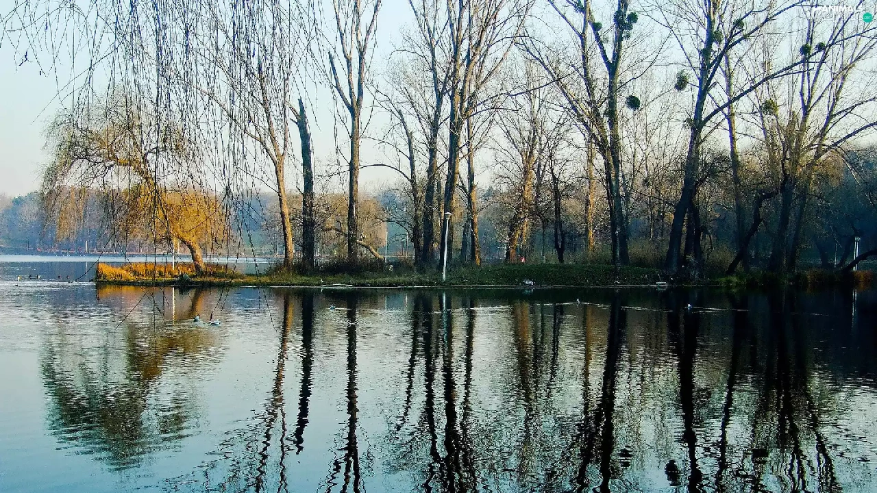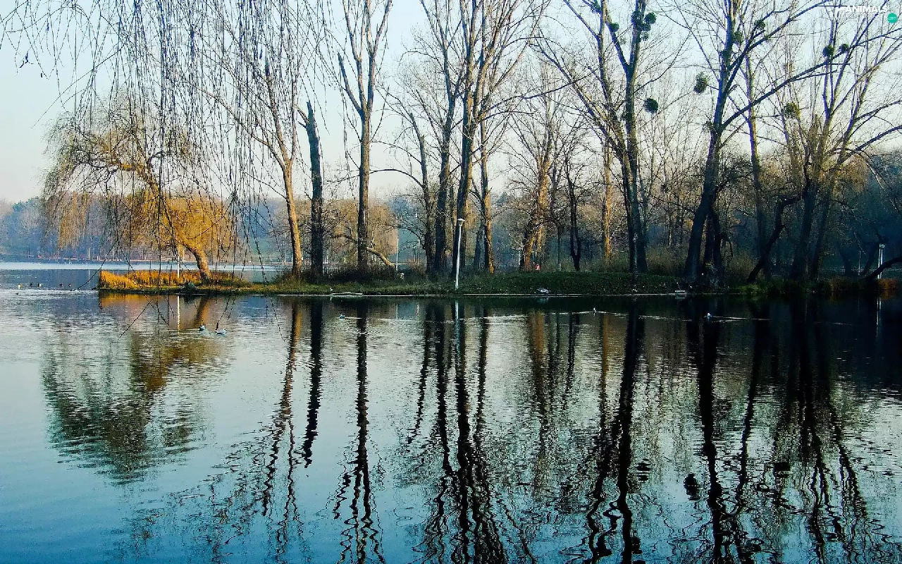 reflection, water, woods, ducks, lake