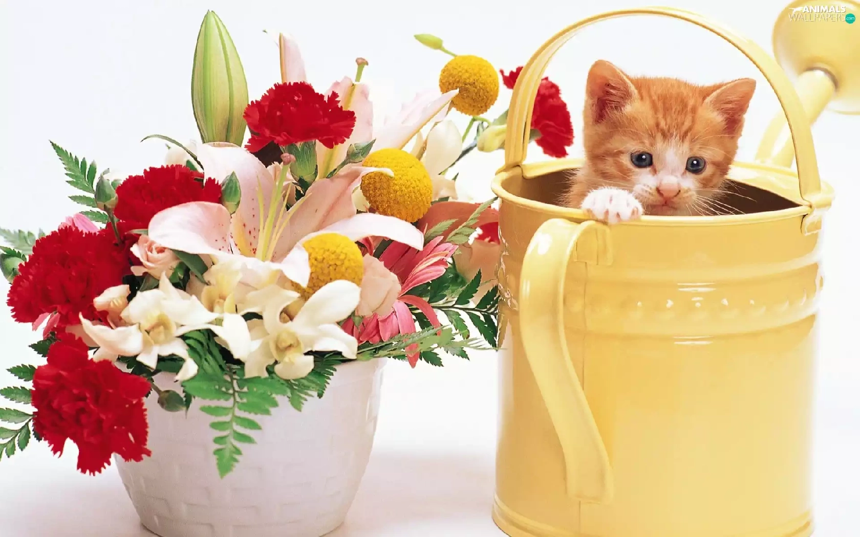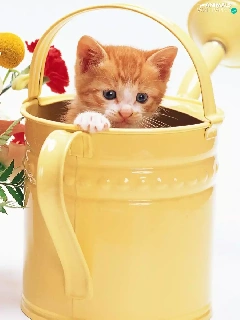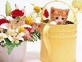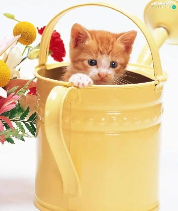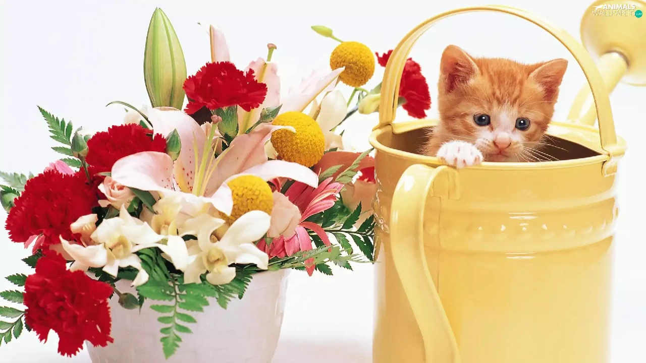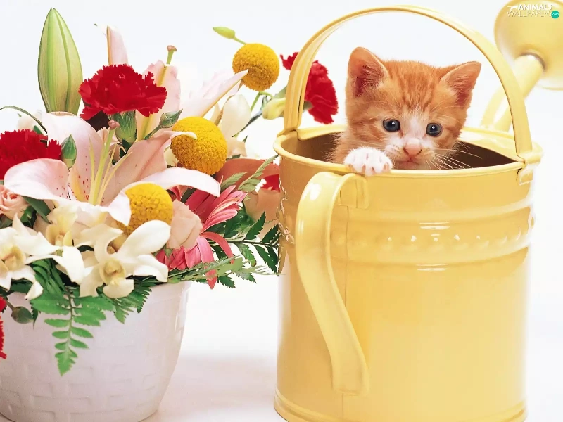 bouquet, flowers, kitten, watering can, small