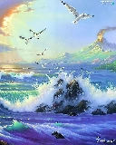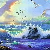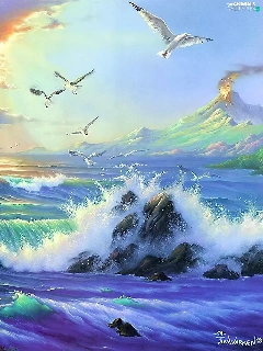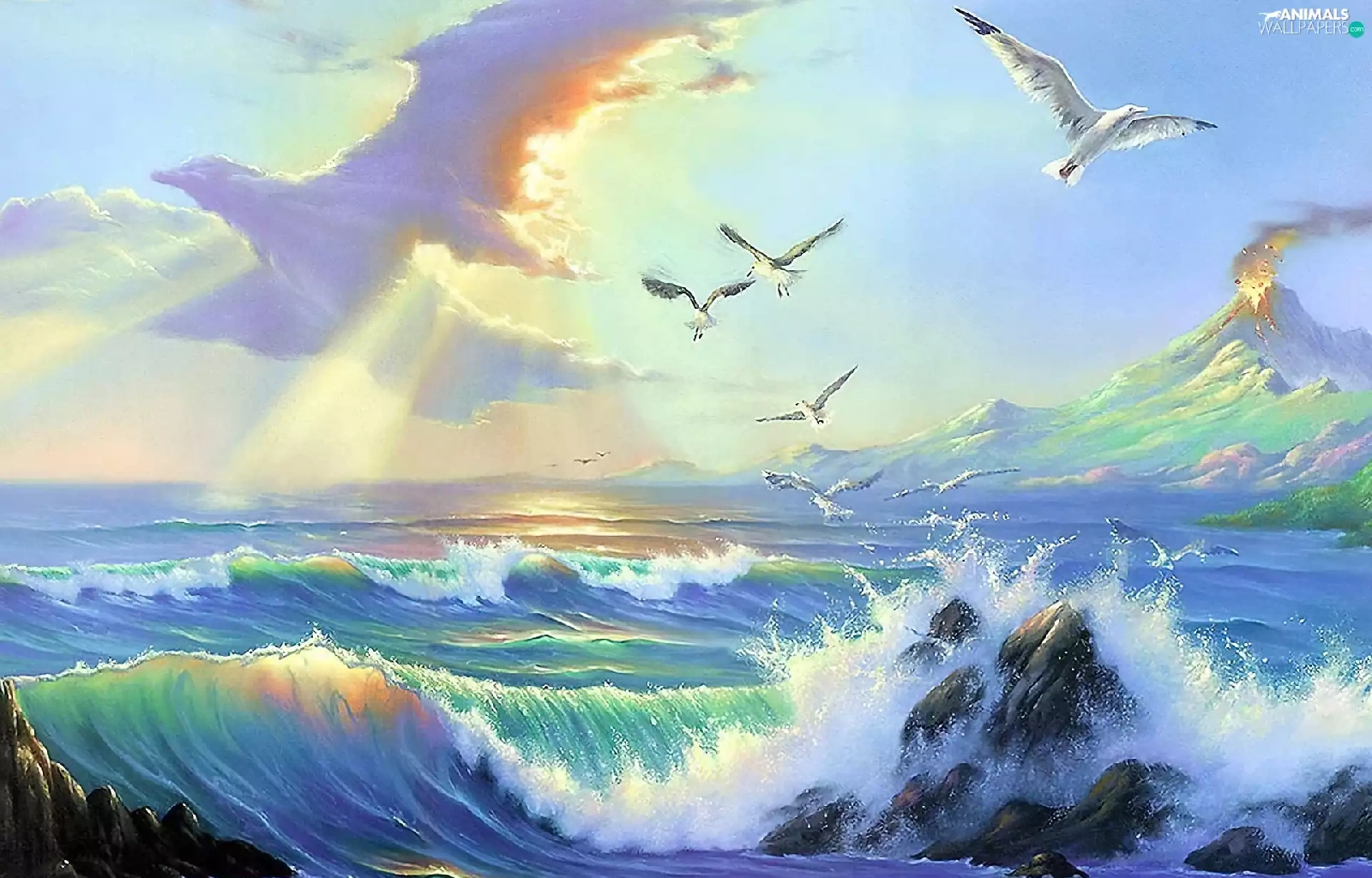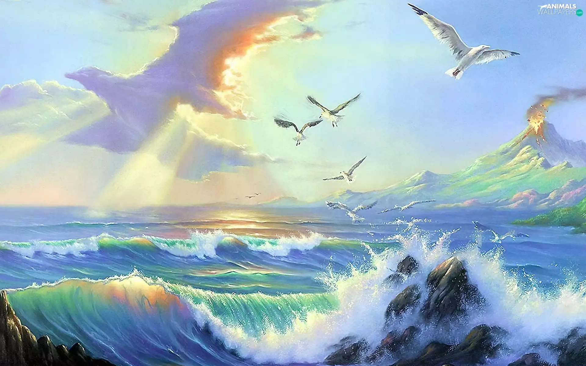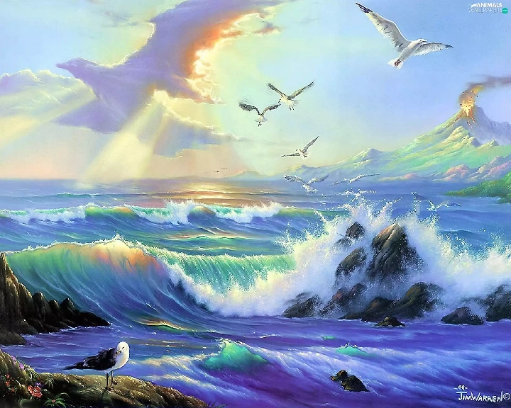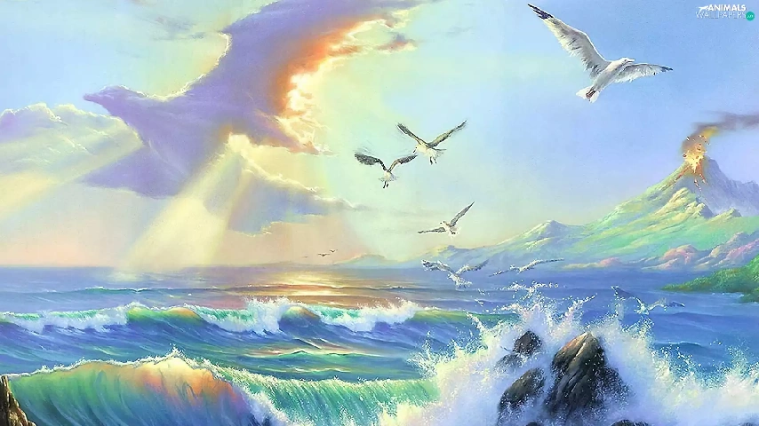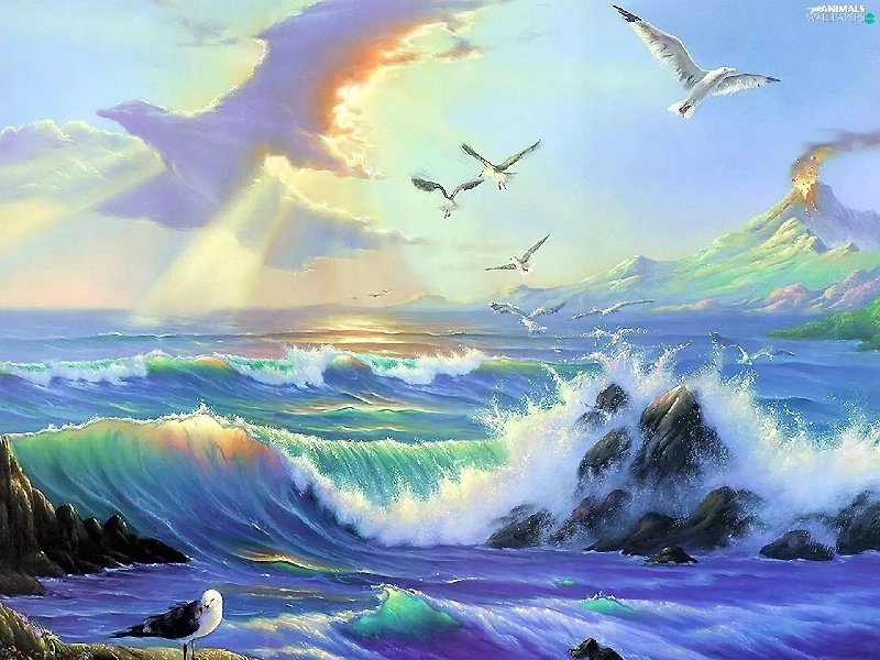 sea, Sky, gulls, Waves