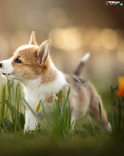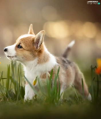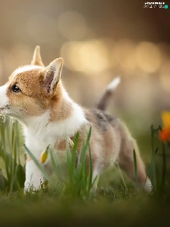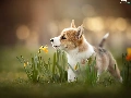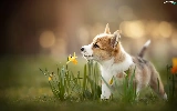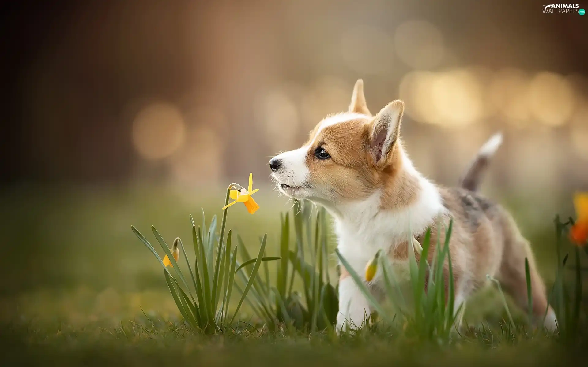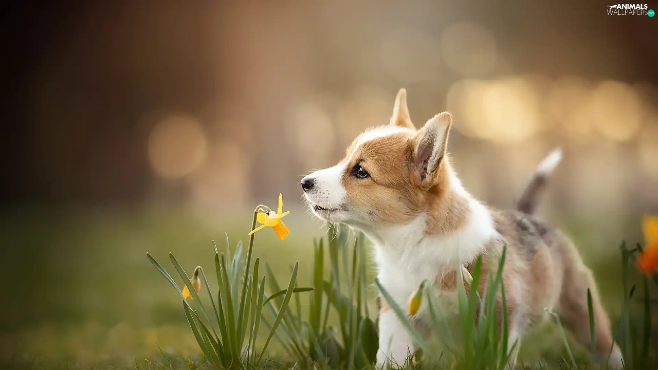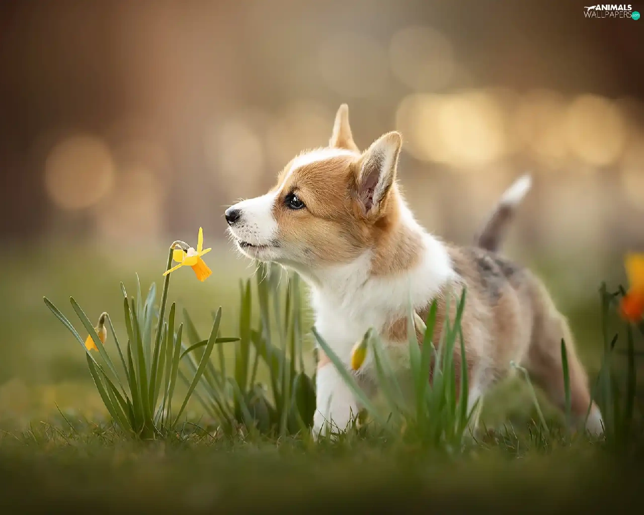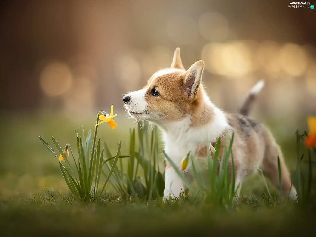 Flowers, Jonquil, Puppy, Welsh corgi pembroke, dog