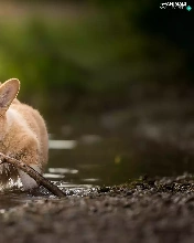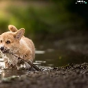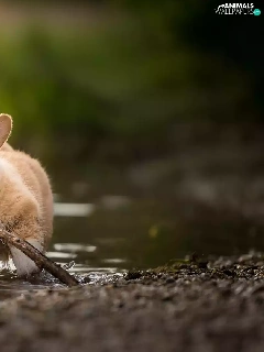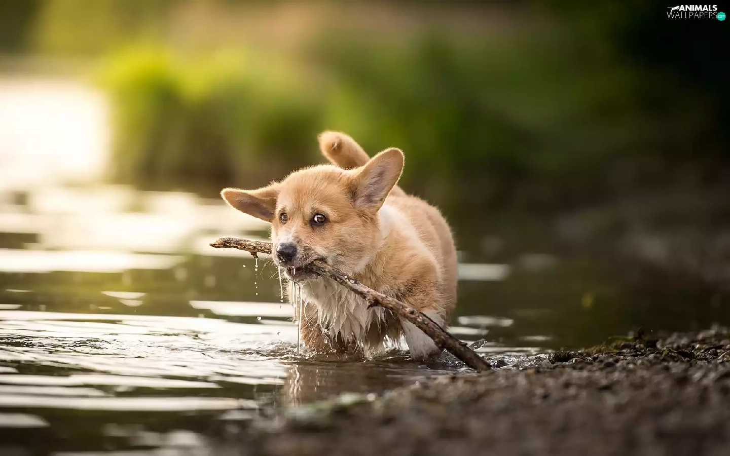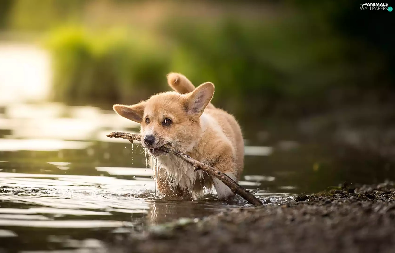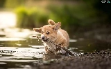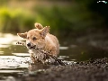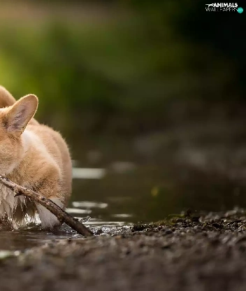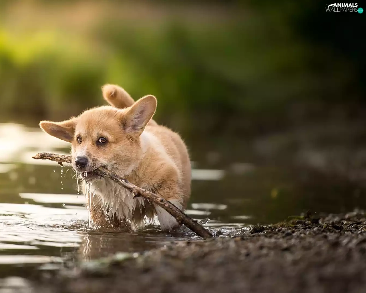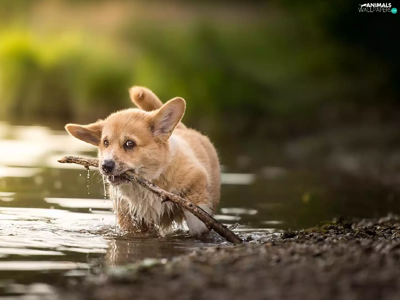 water, stick, Puppy, Welsh corgi pembroke, dog