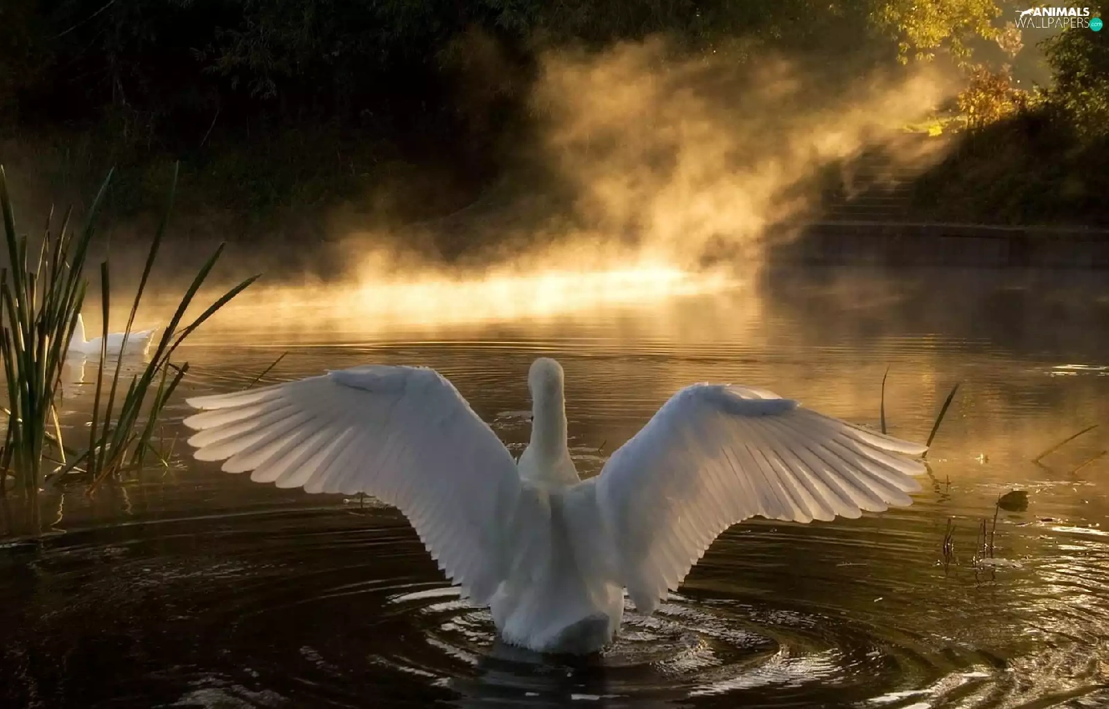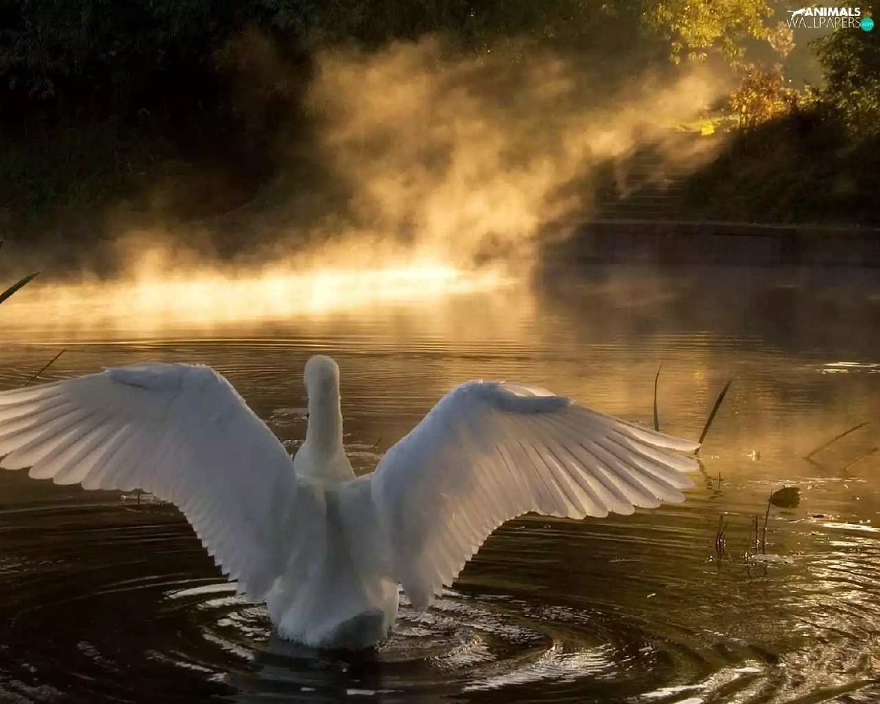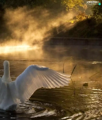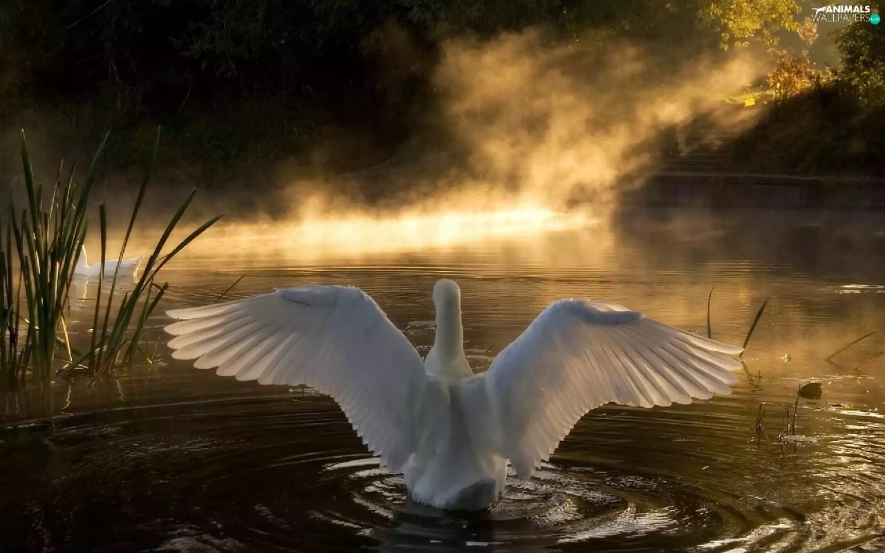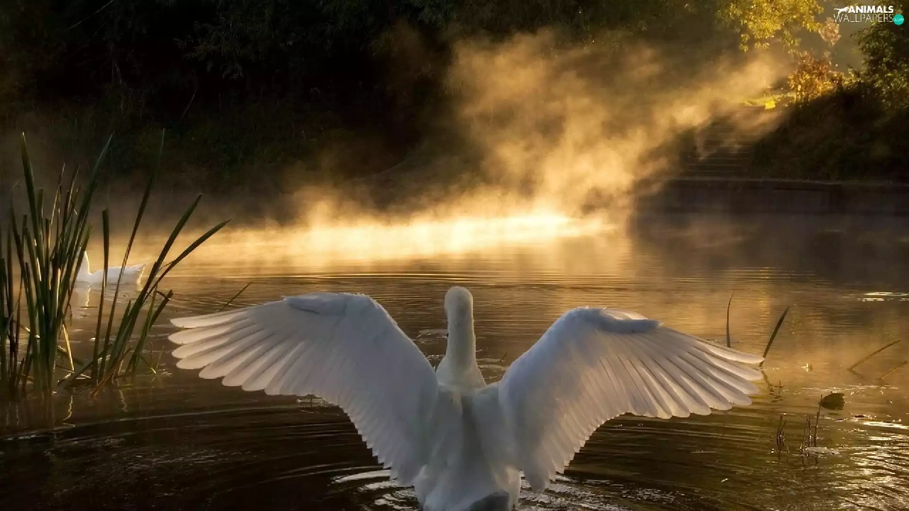 lake, sun, Swans, west