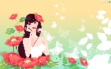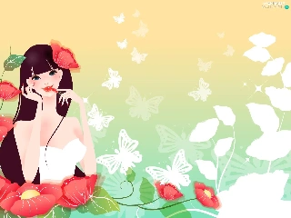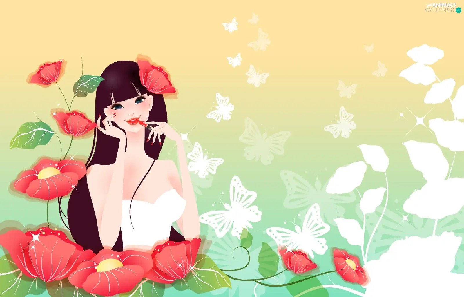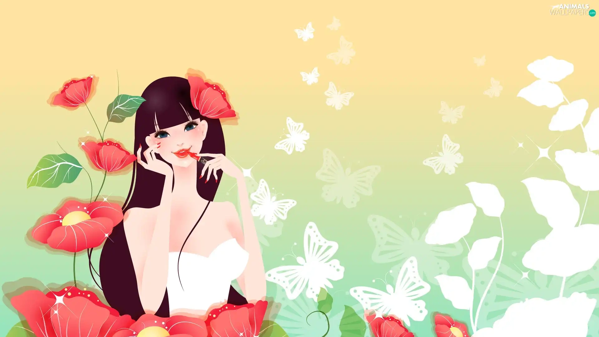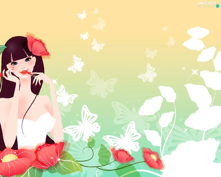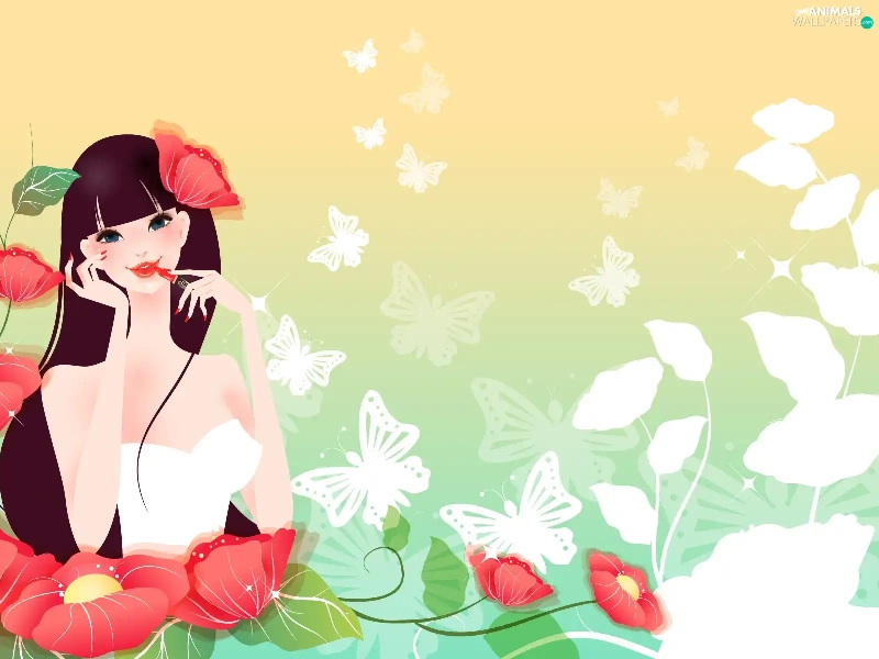 Flowers, girl, White, butterflies, lipstick, Red