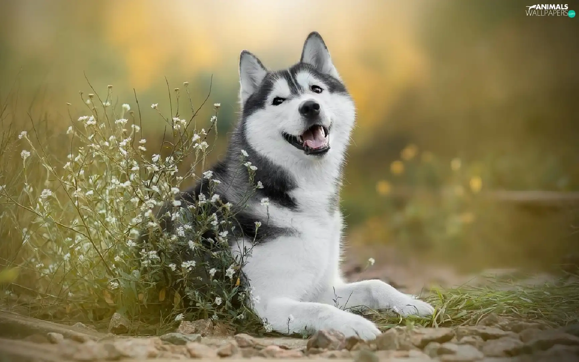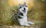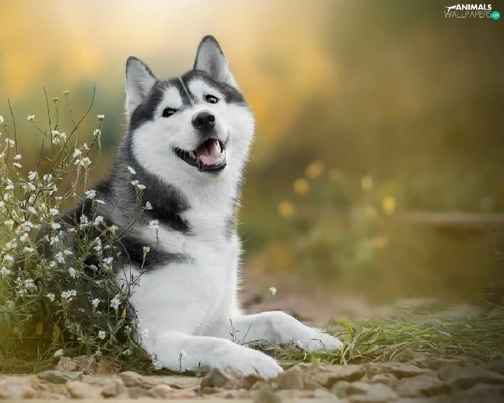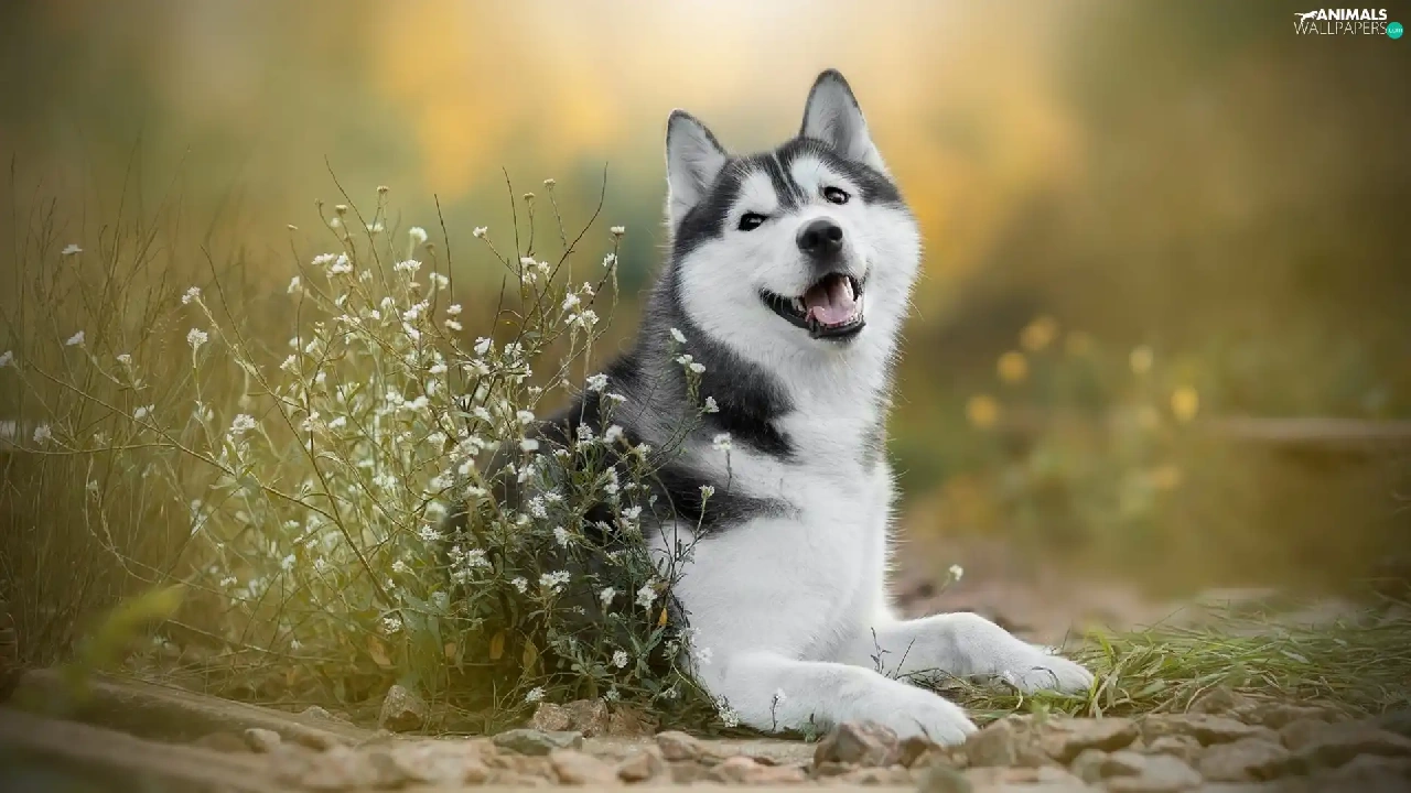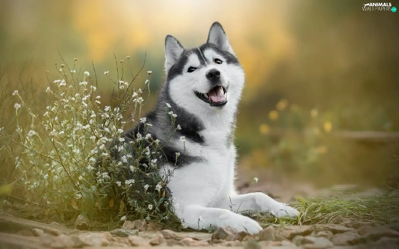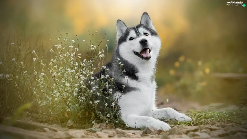 dog, White, Flowers, Siberian Husky