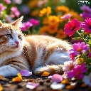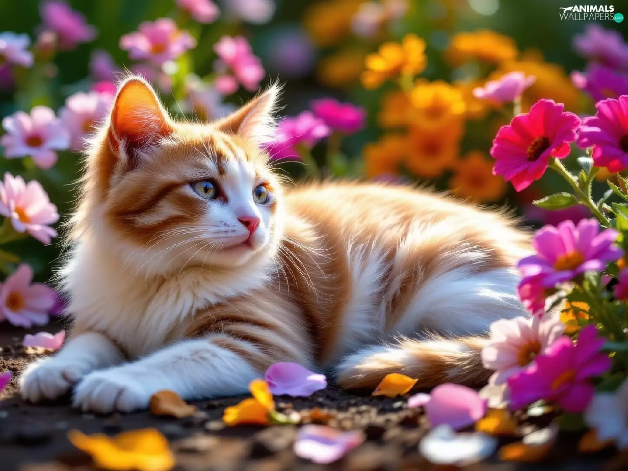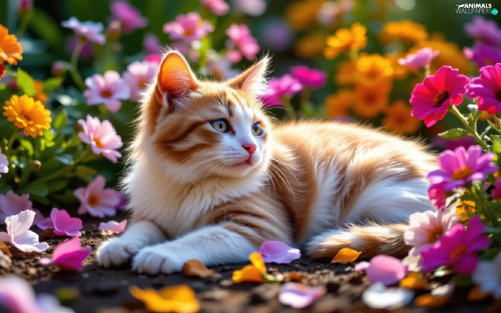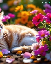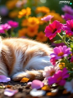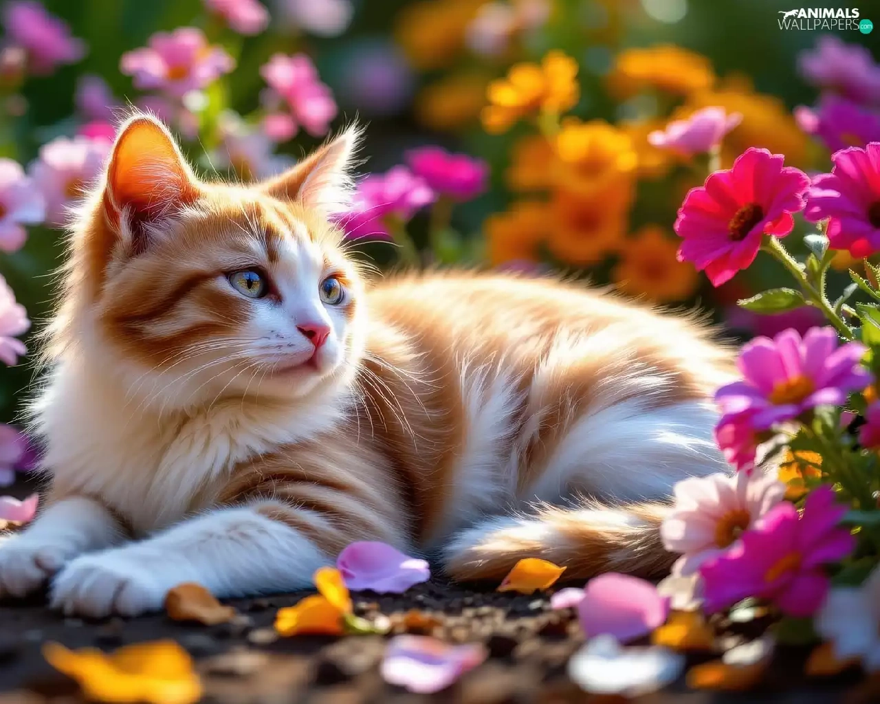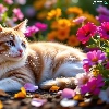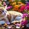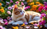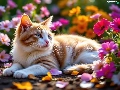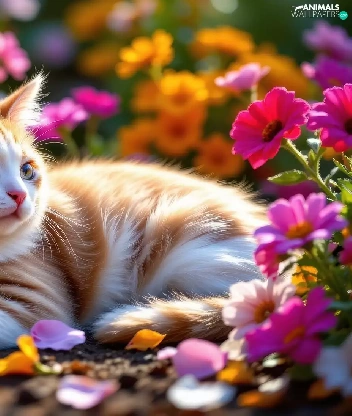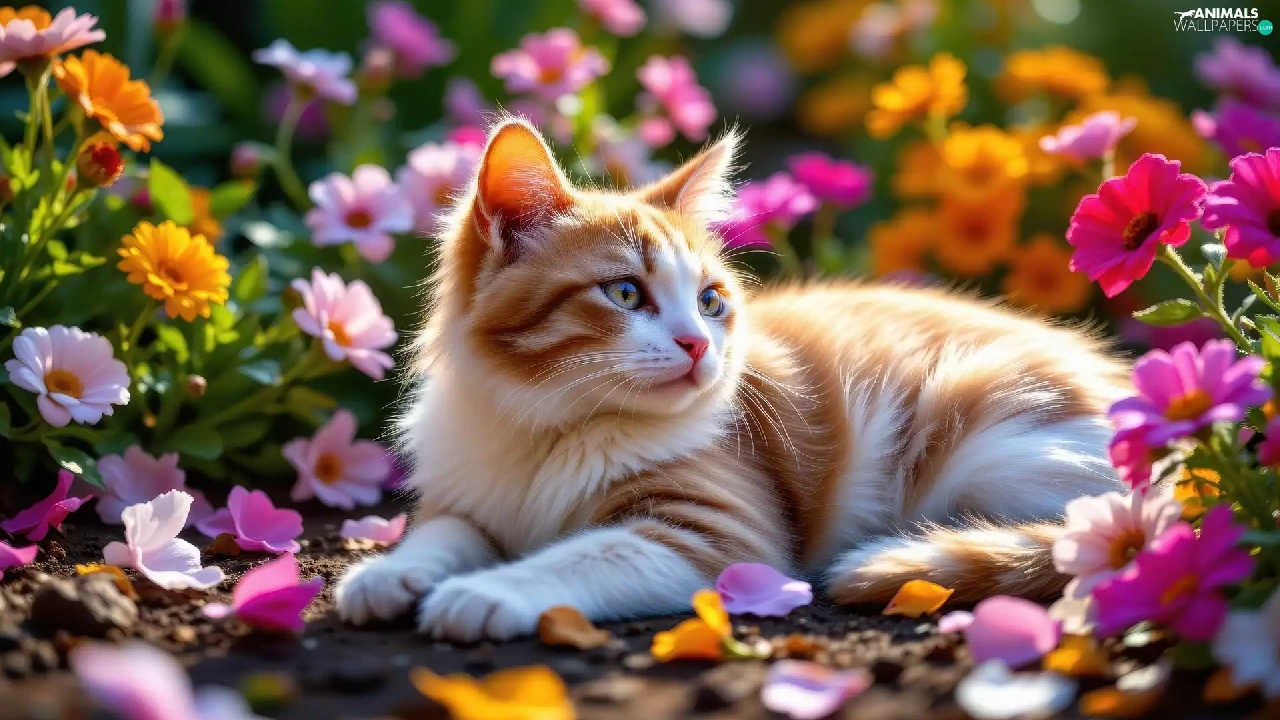 Flowers, cat, Red-white