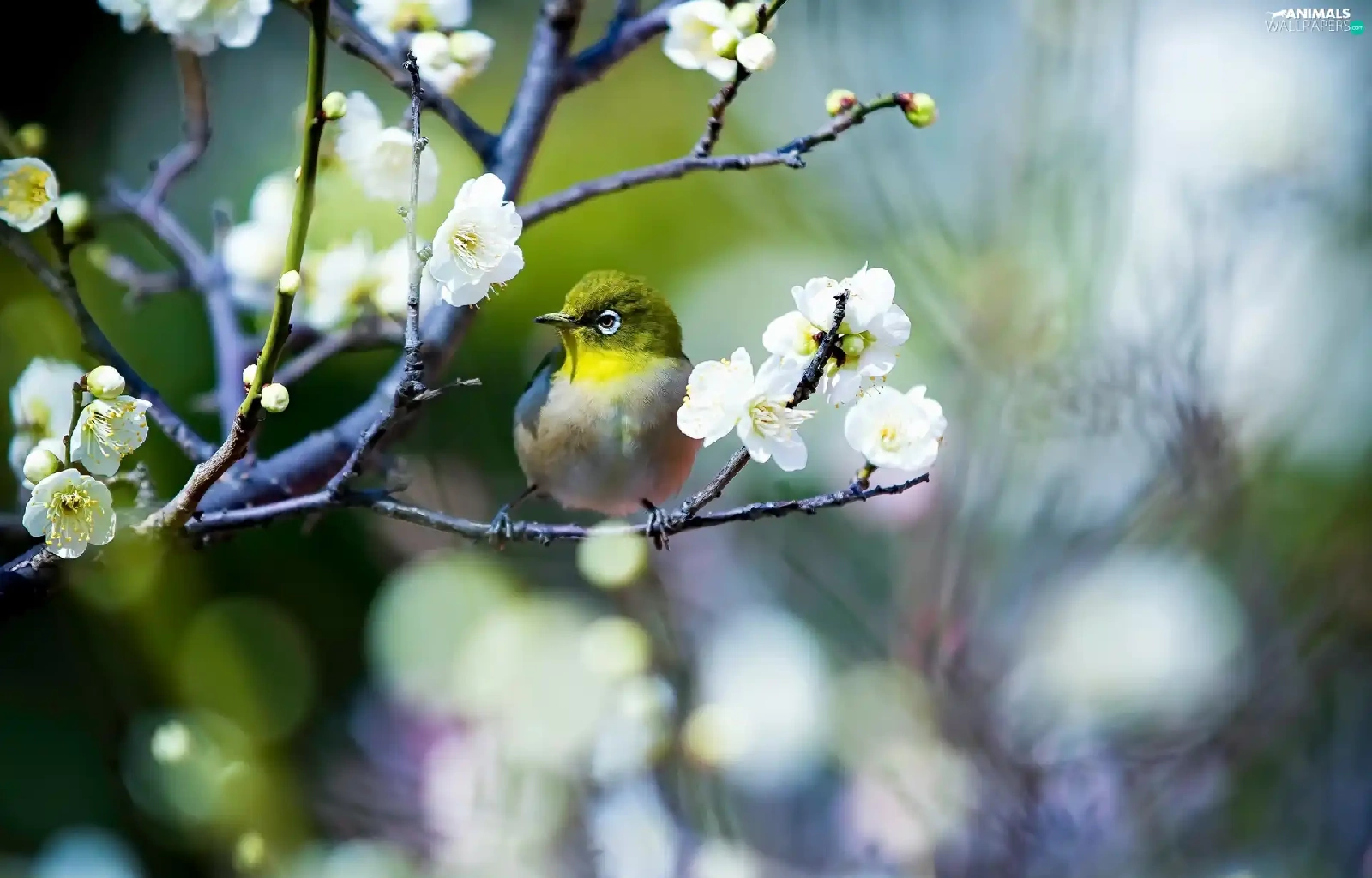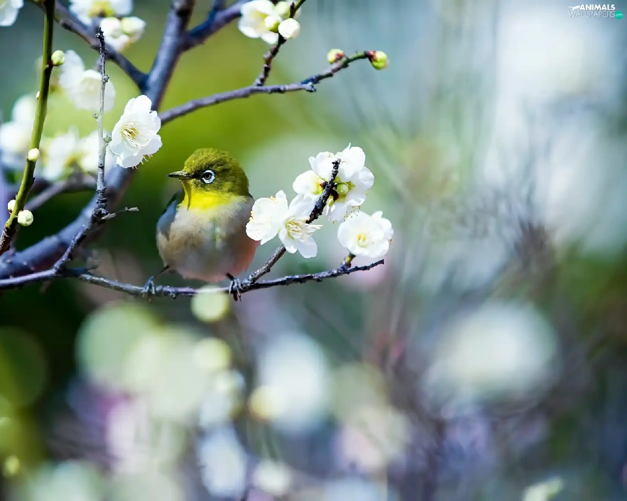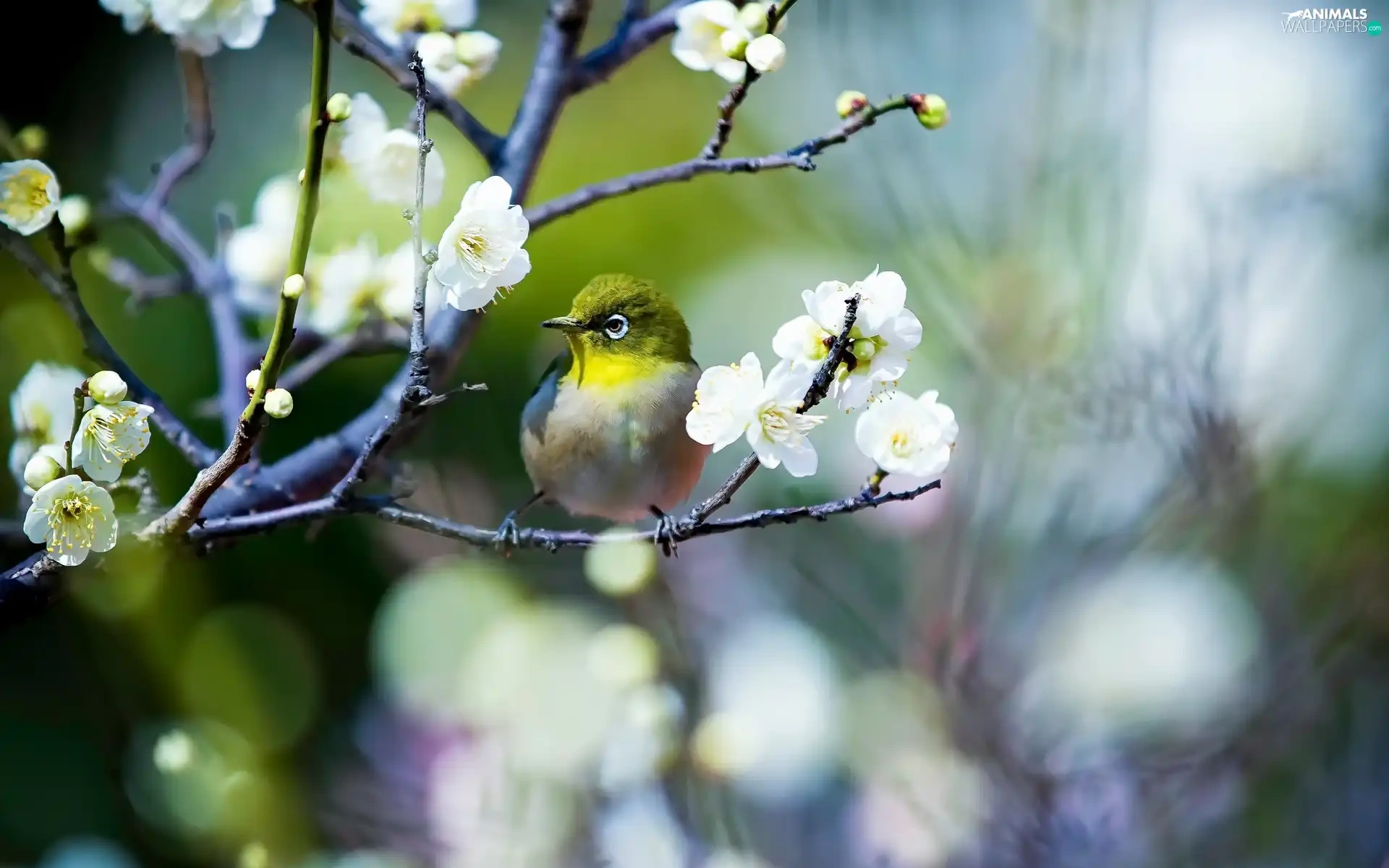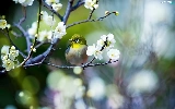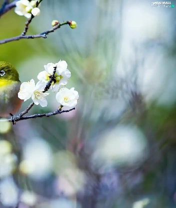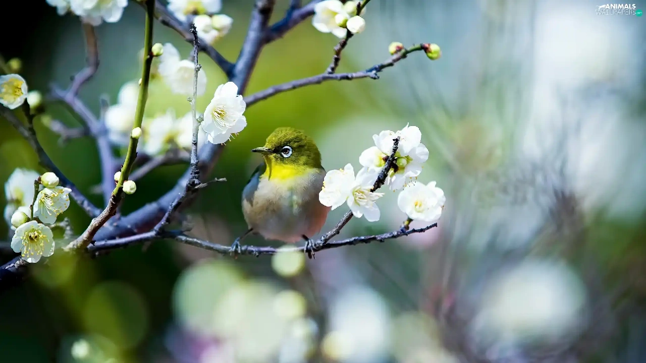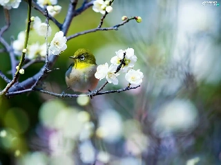 Flowers, Spring, Japanese White-eye, twig, Bird