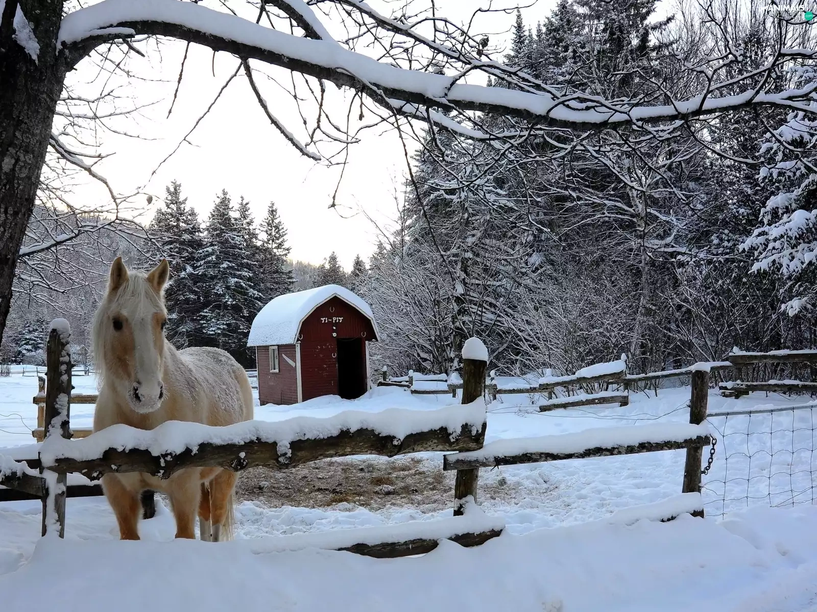 woods, winter, fence, Mountains, Horse
