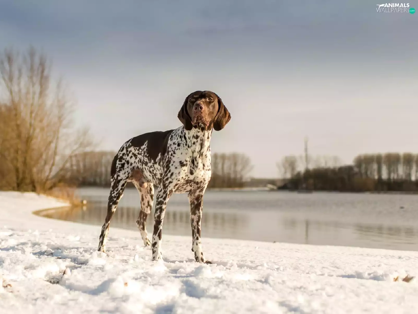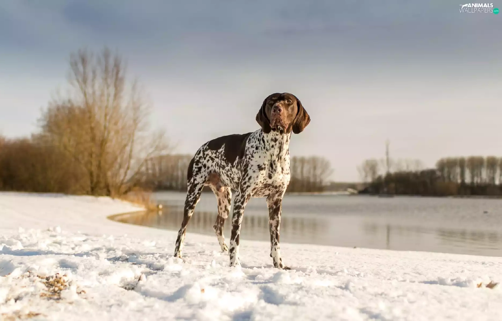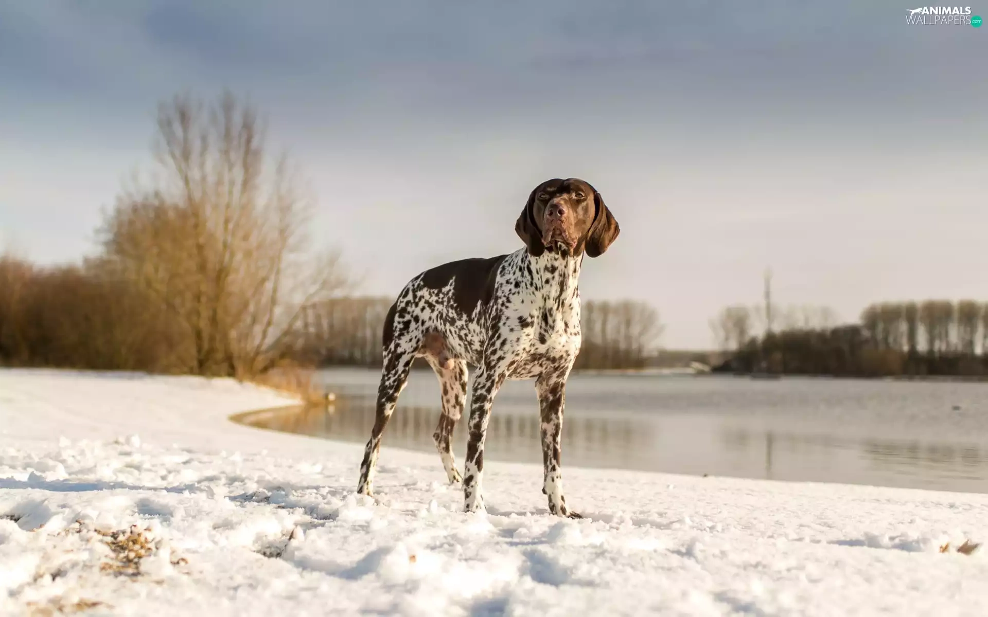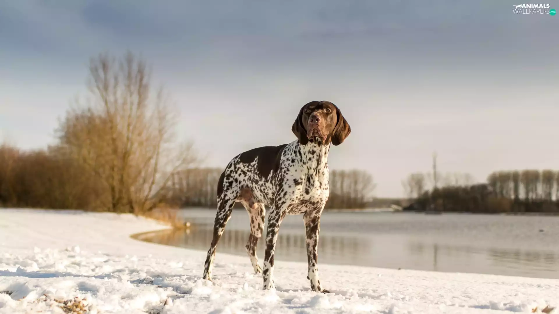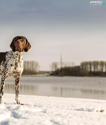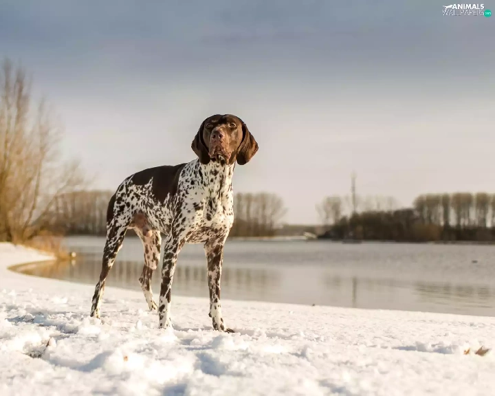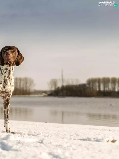snow, lake, landscape, winter, German Shorthaired Pointer