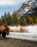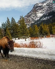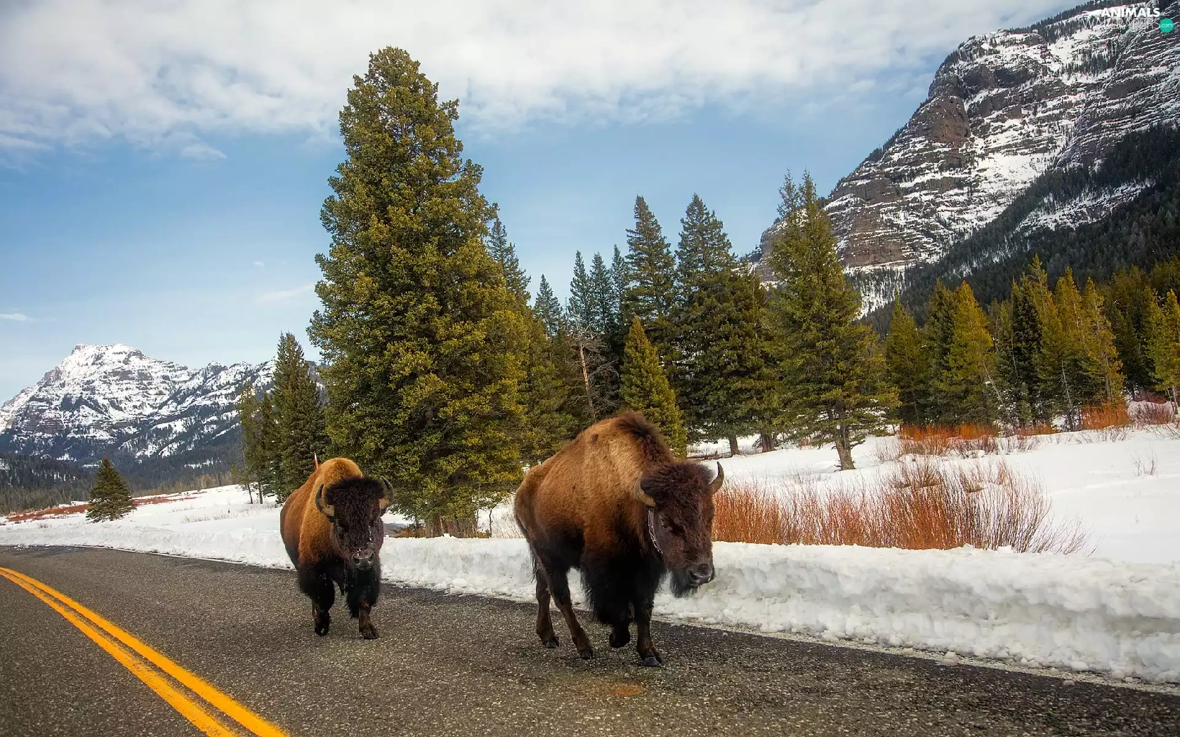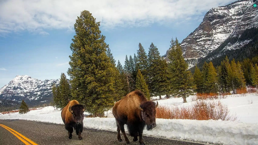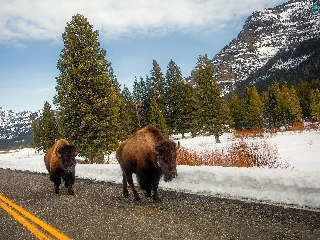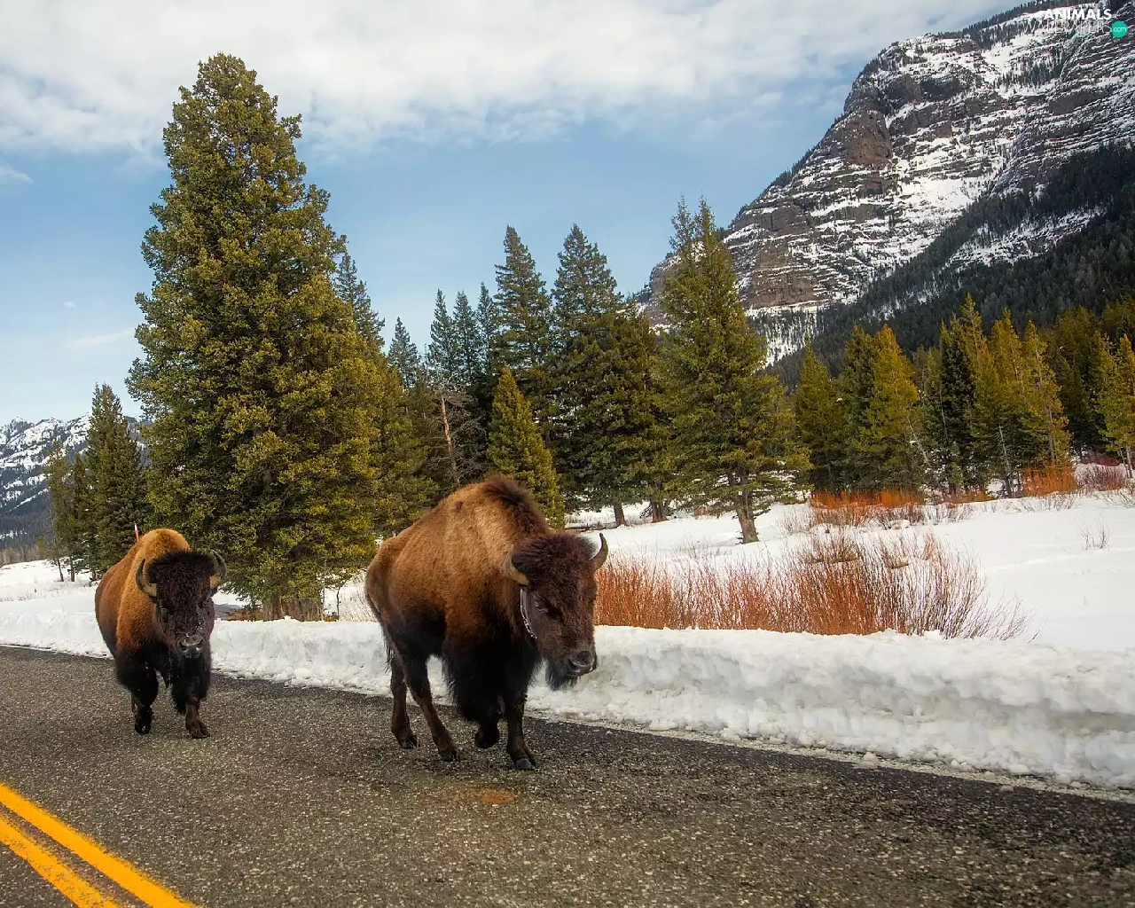 trees, bison, Mountains, Way, Two cars, viewes, winter