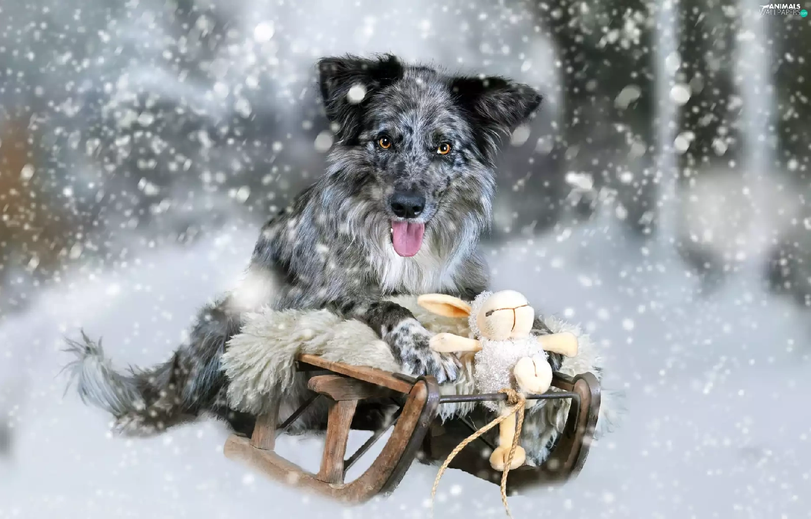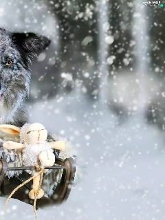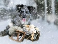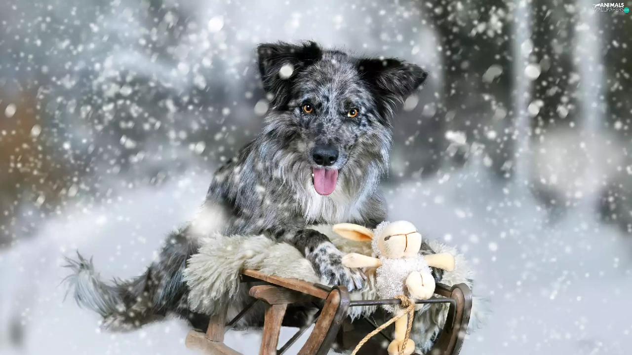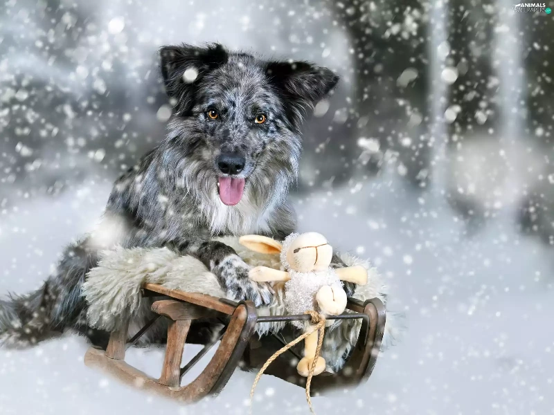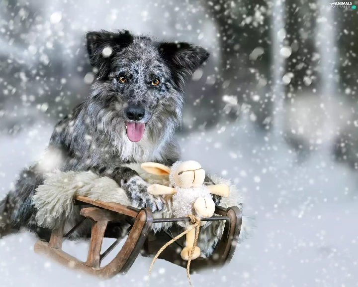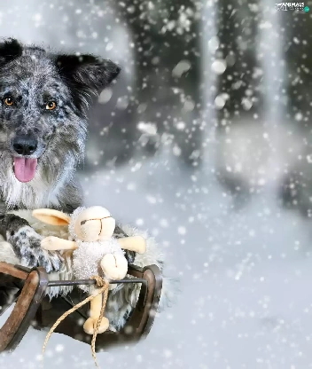 winter, Border Collie, toy, Blue merle coat, dog, snow, sledge