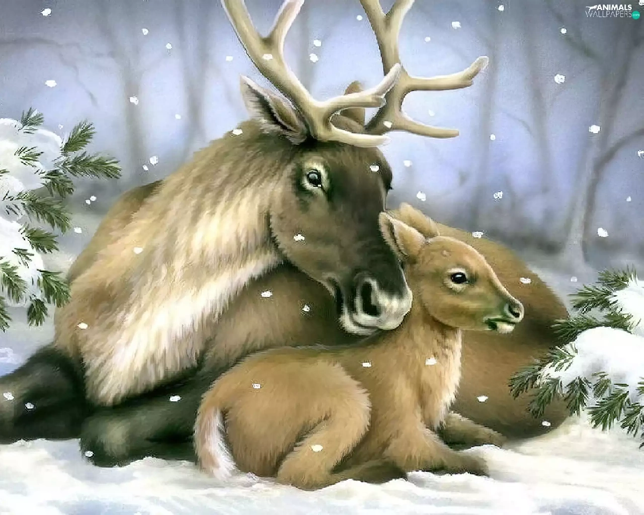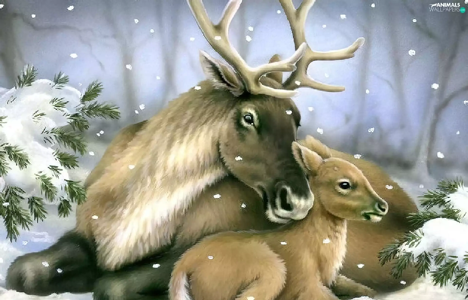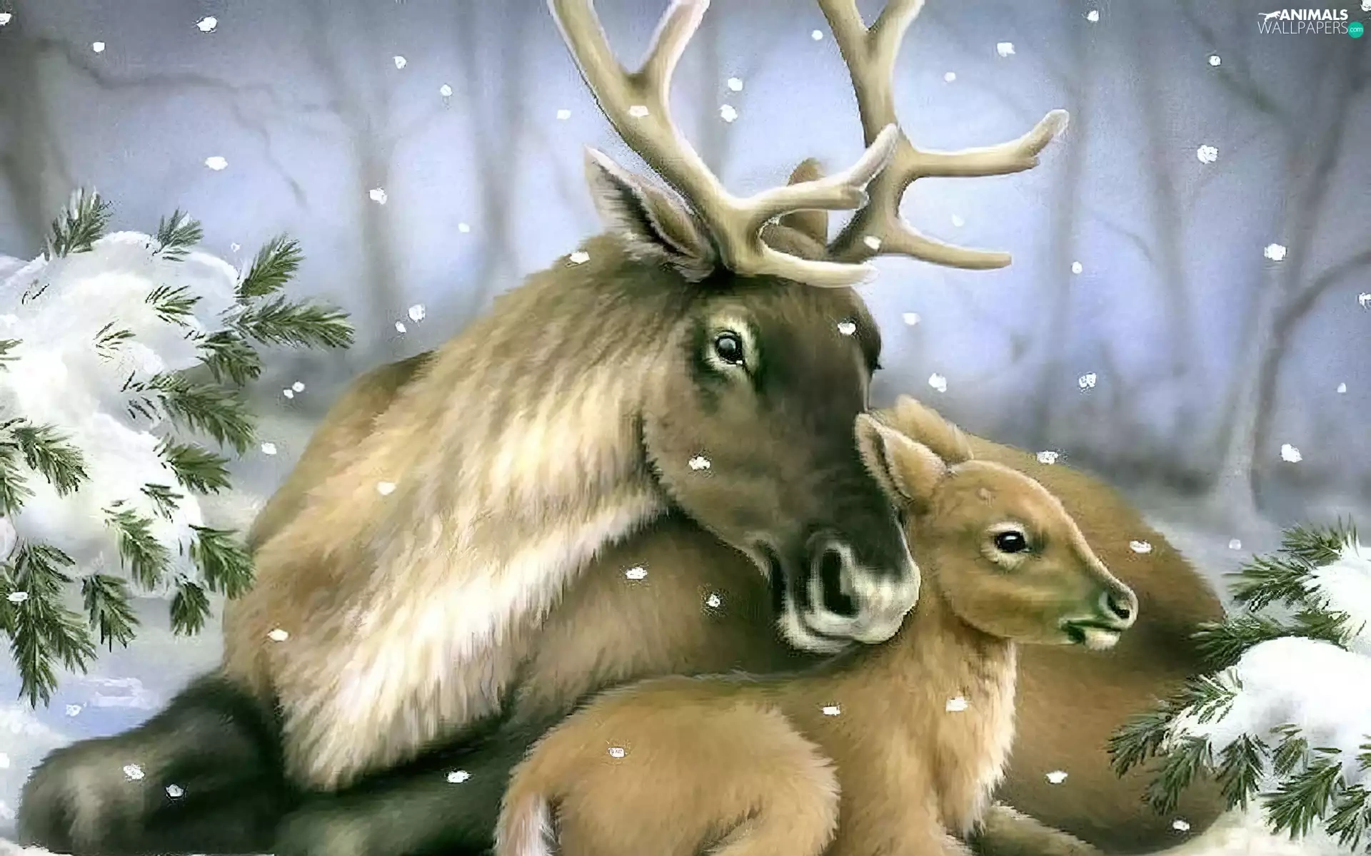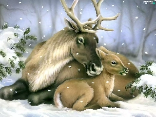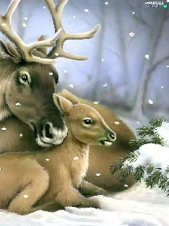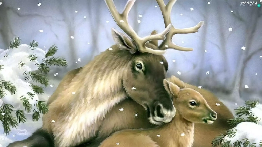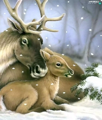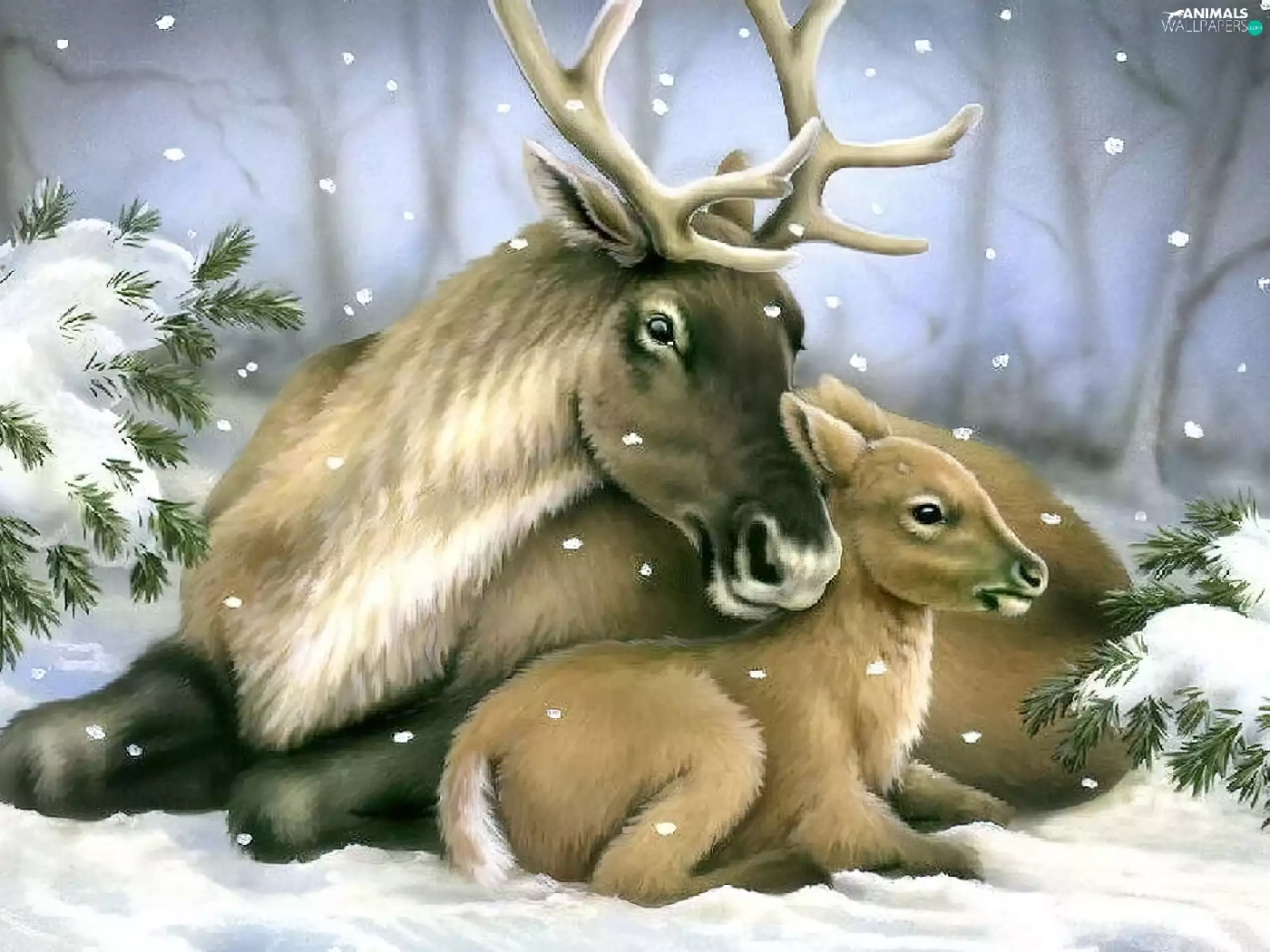 winter, deer, Spruces