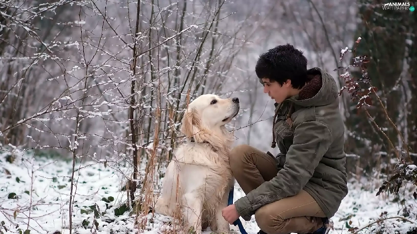 forest, dog, wander, Golden Retriever, girl, Path, winter