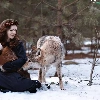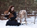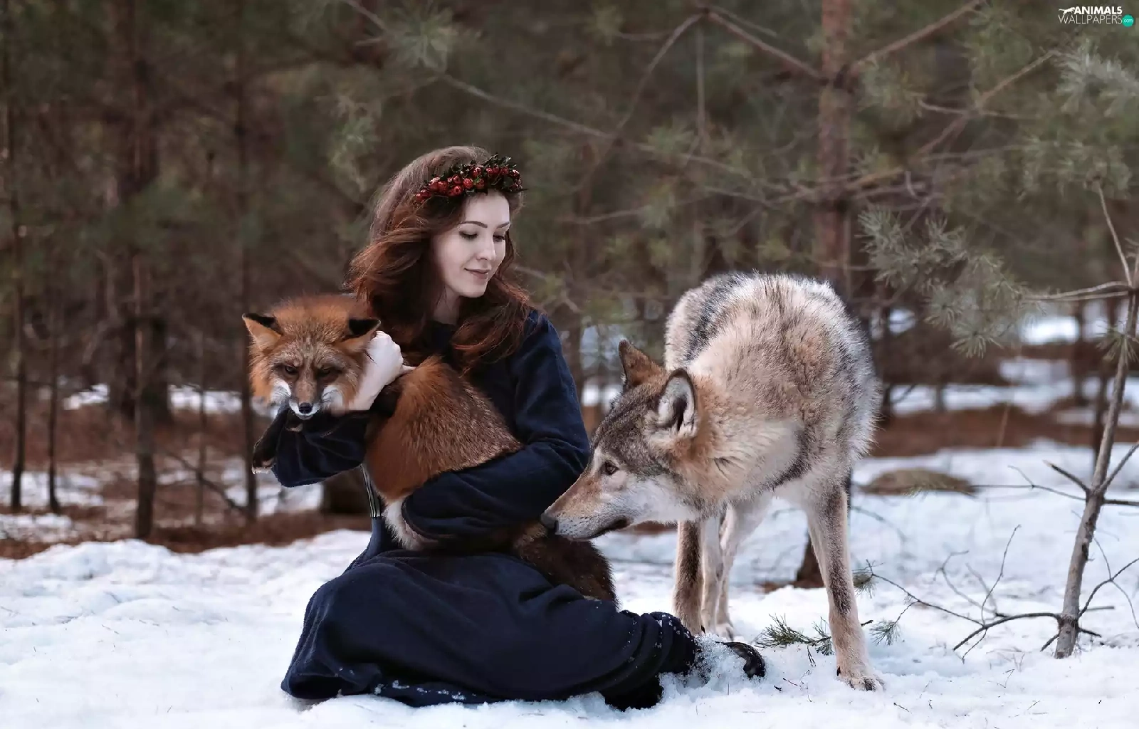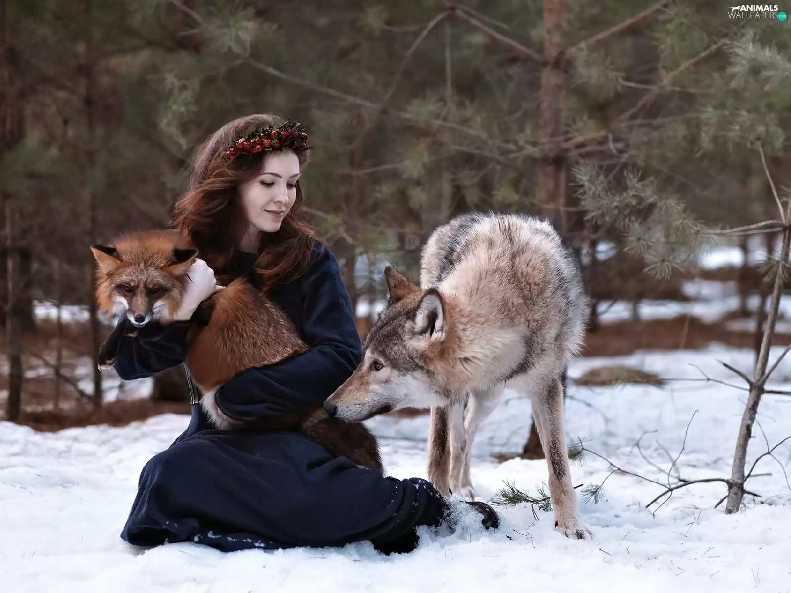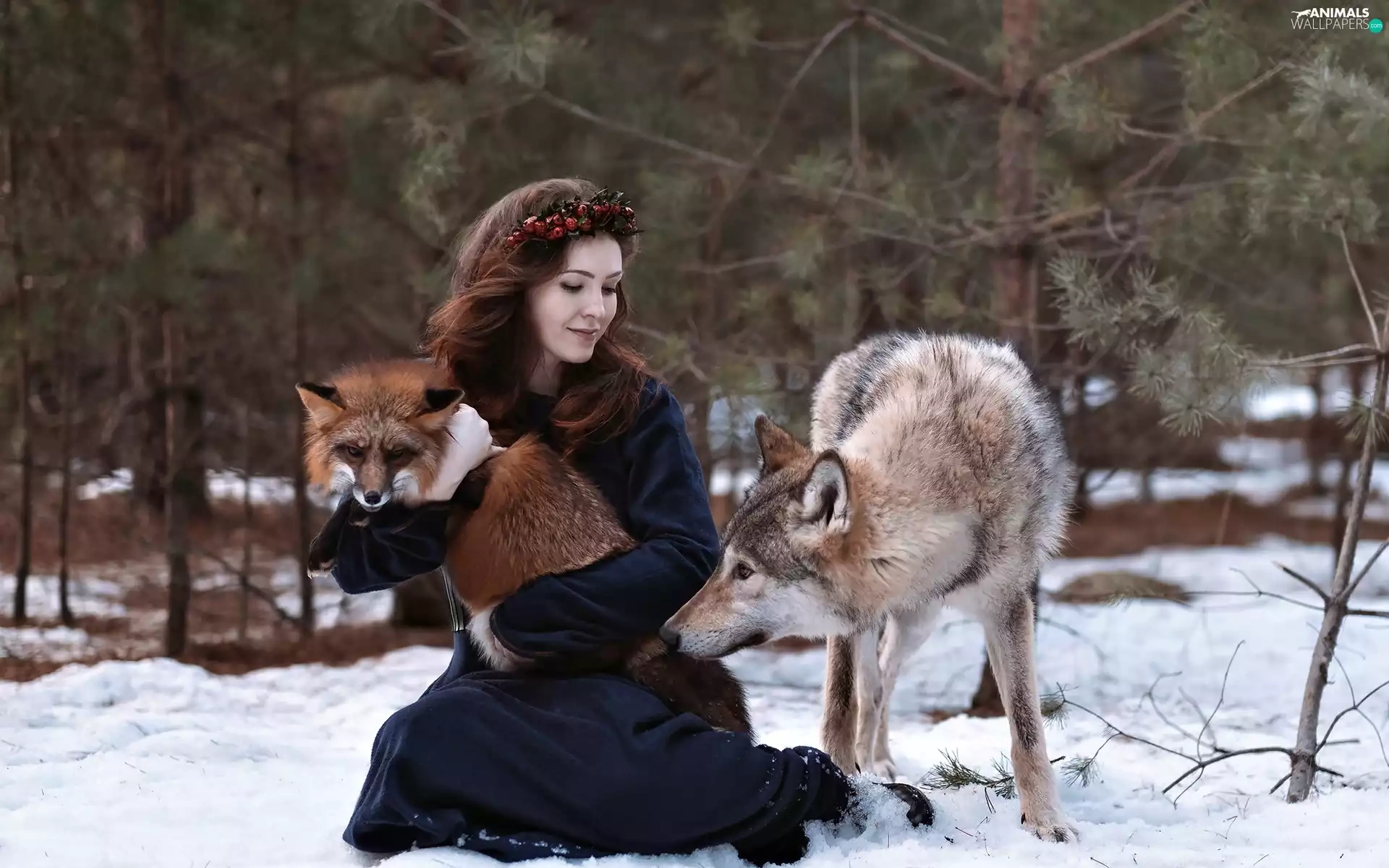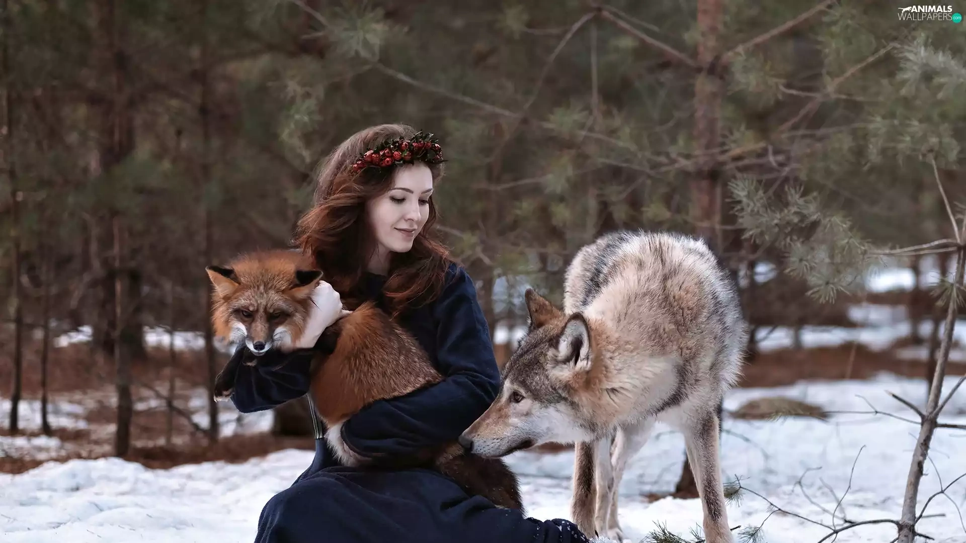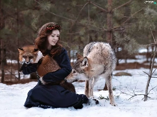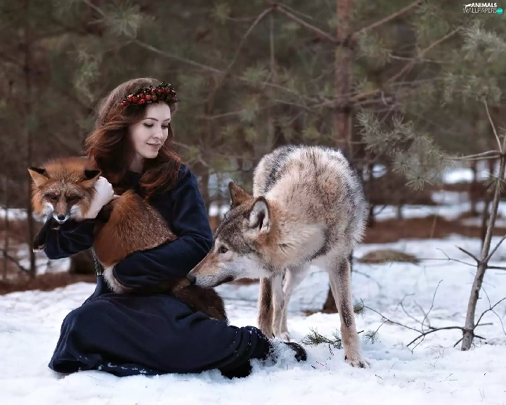 Wolf, winter, wreath, Fox, Women