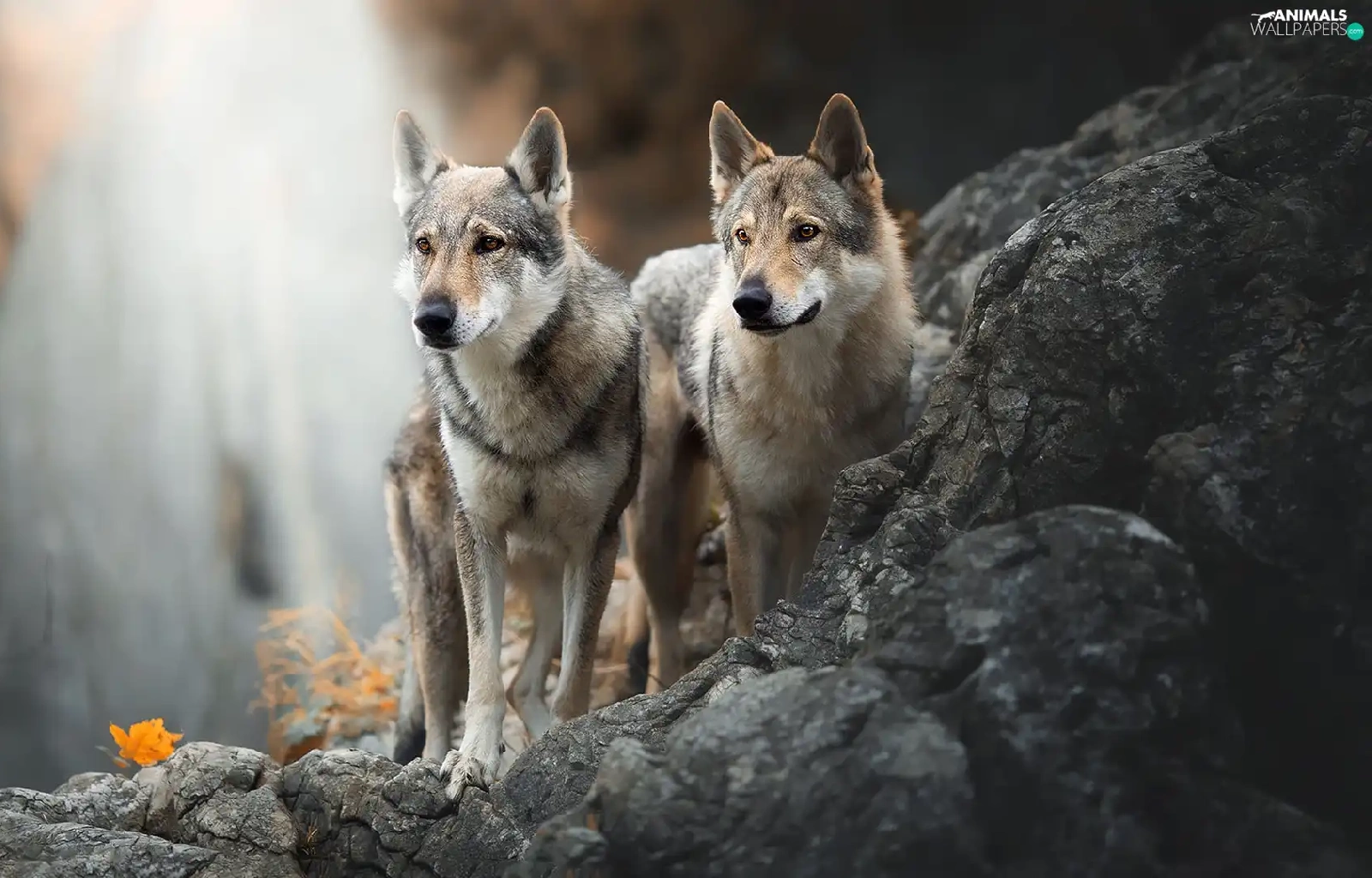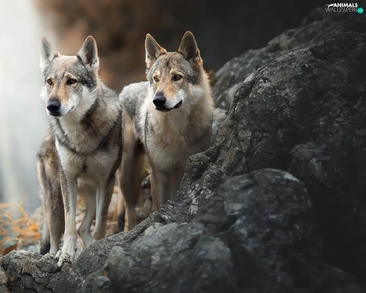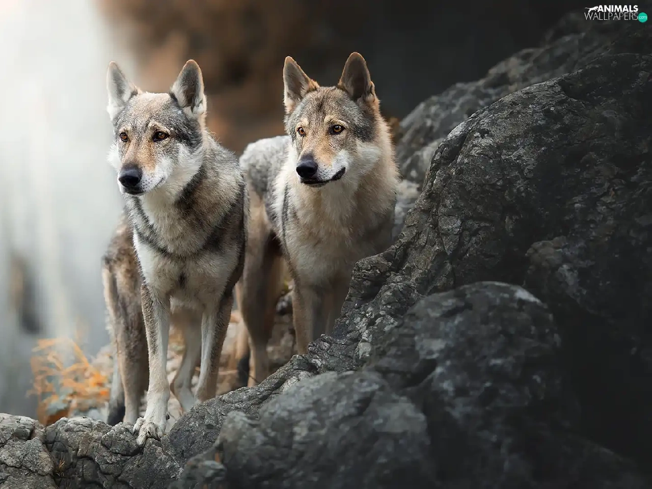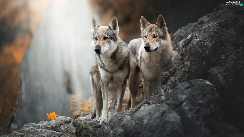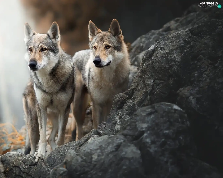 Two cars, Czechoslovakian Wolfdog, Rocks, Dogs