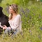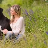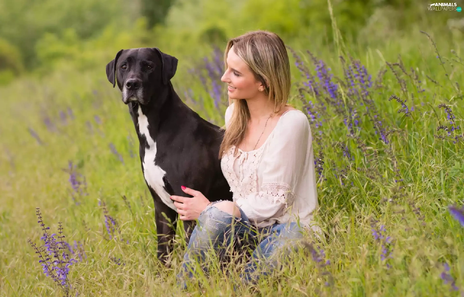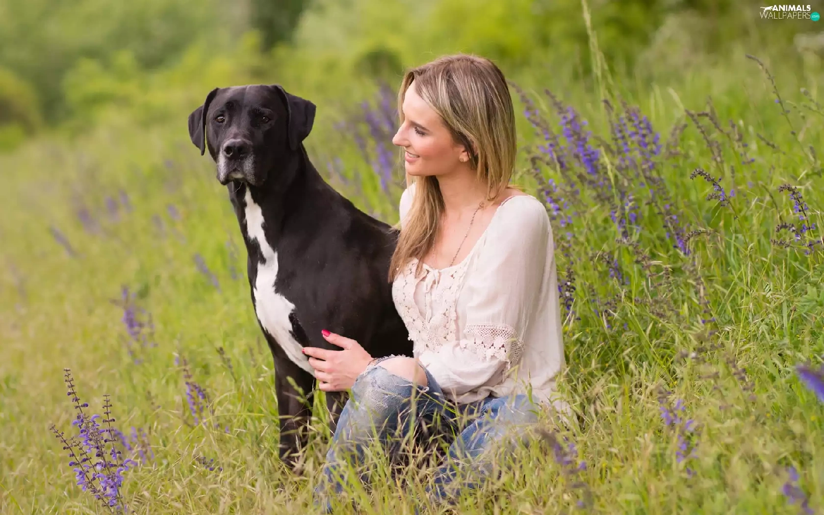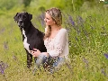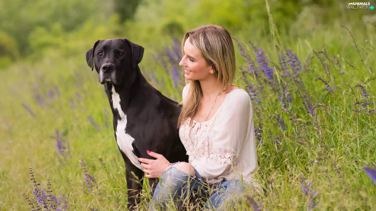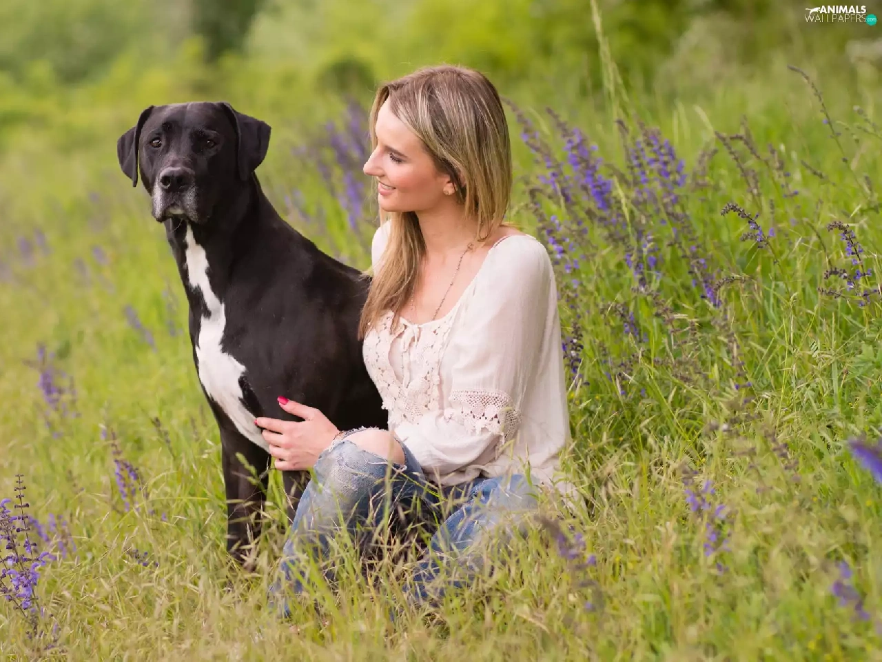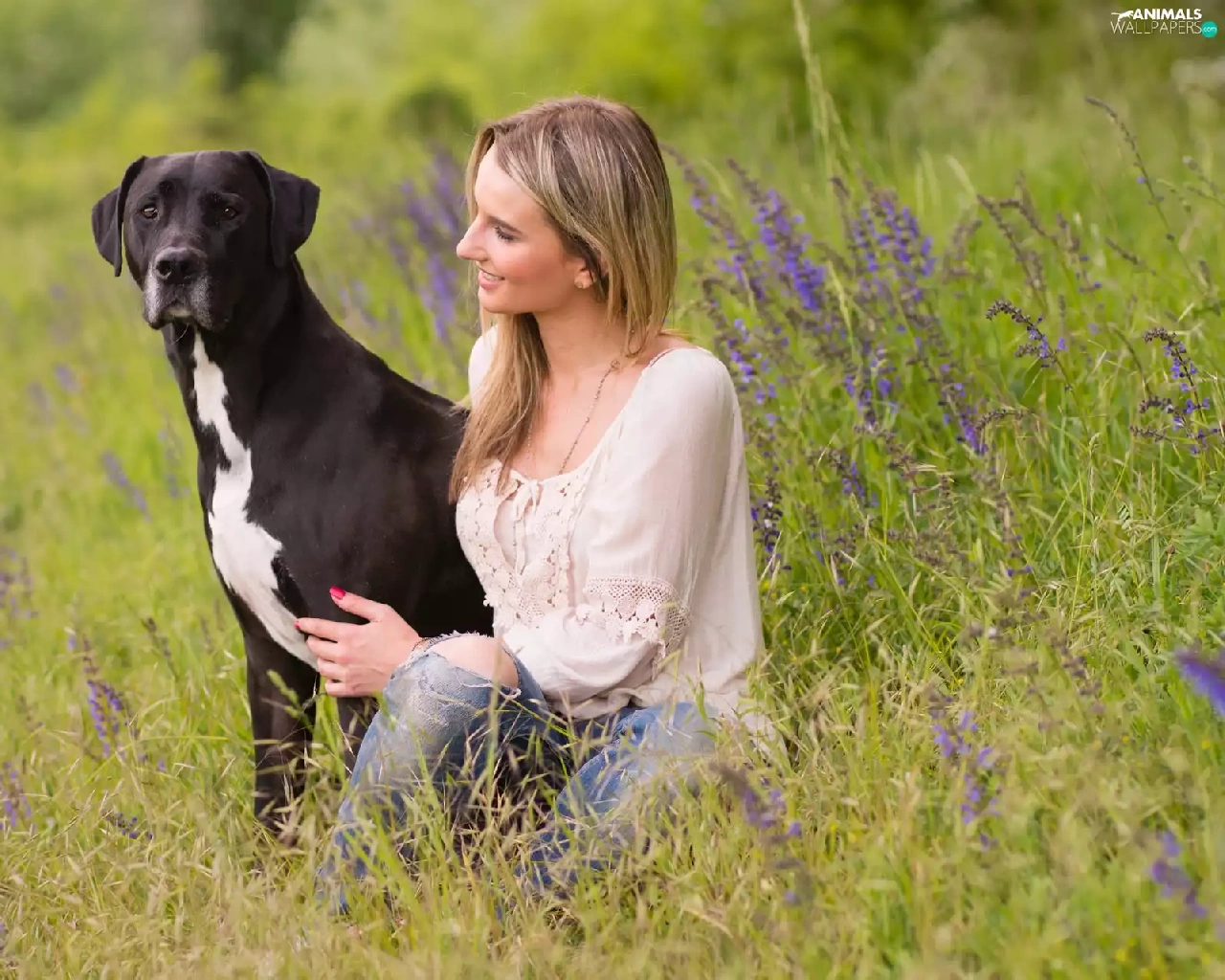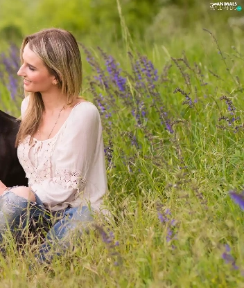 dog, Meadow, Flowers, Women
