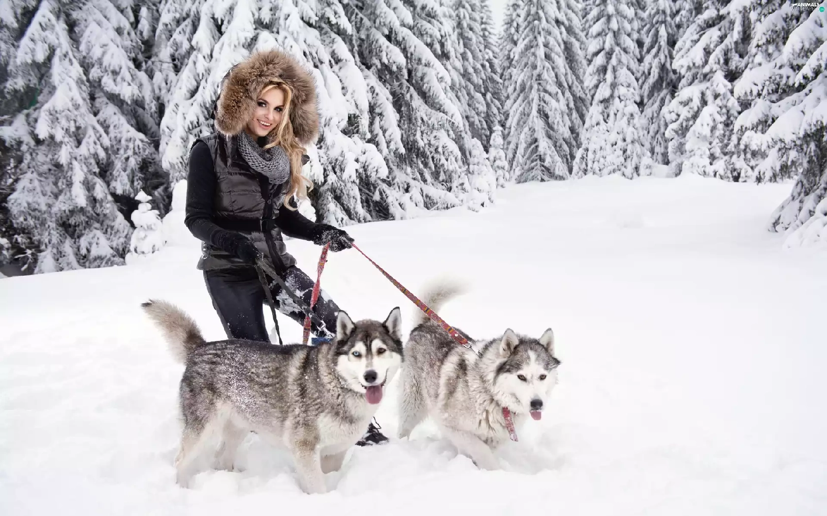 winter, Women, Siberian Husky, forest