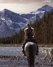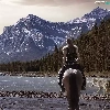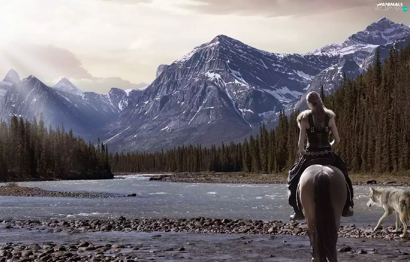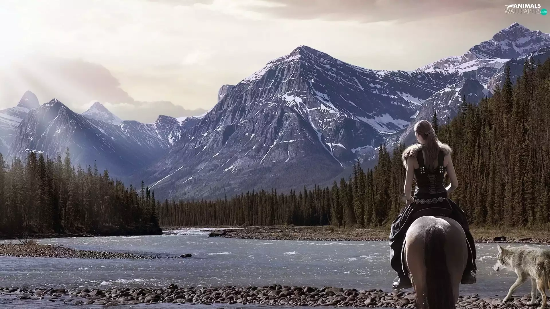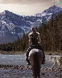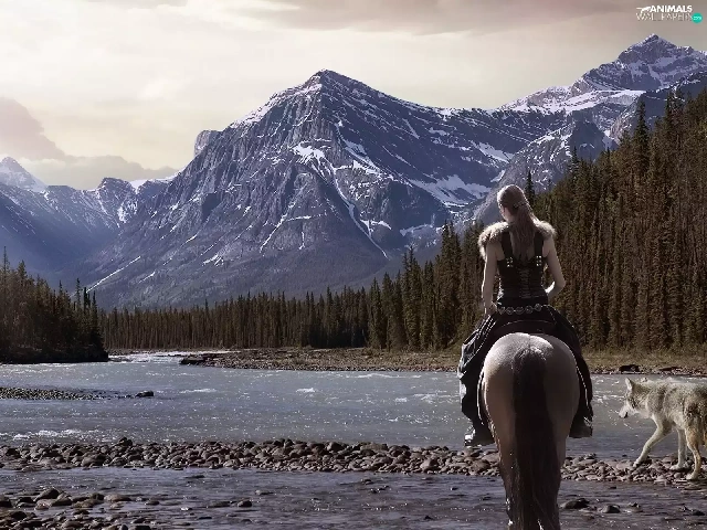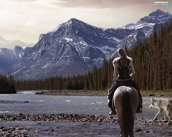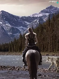 dog, Women, Mountains, woods, River, Horse