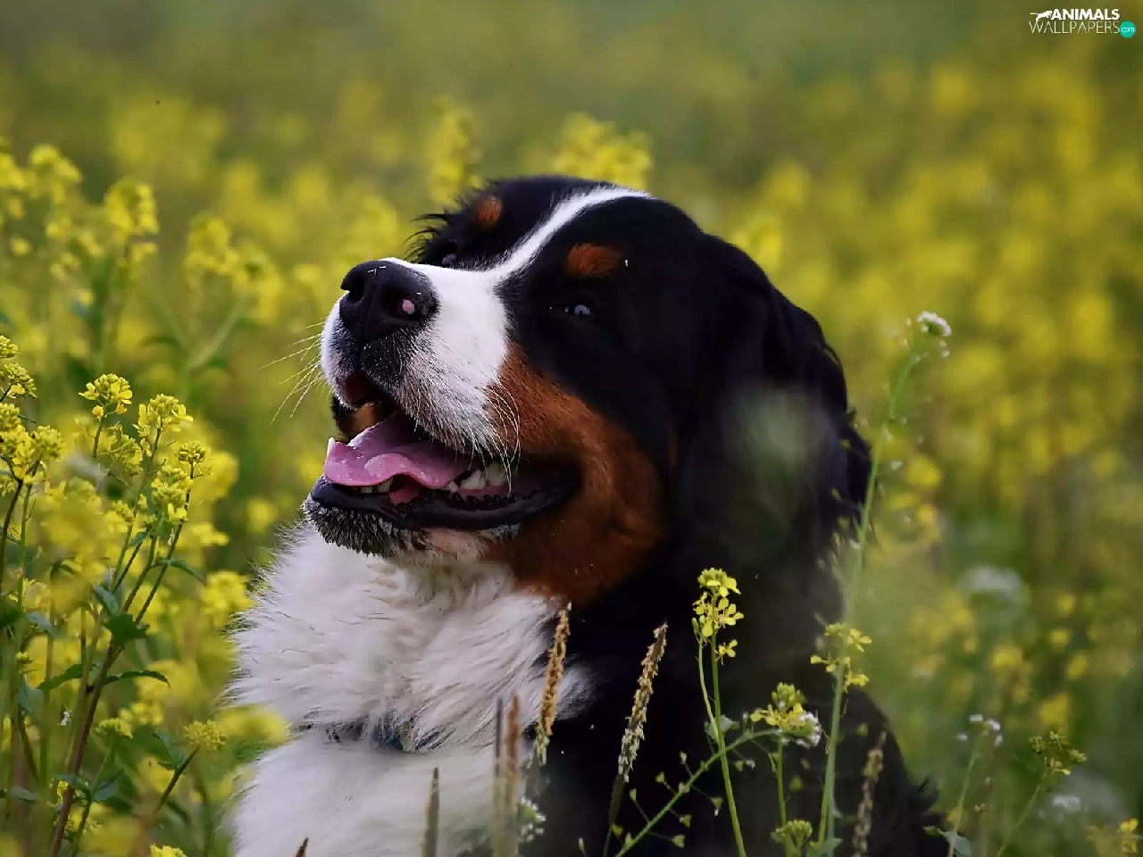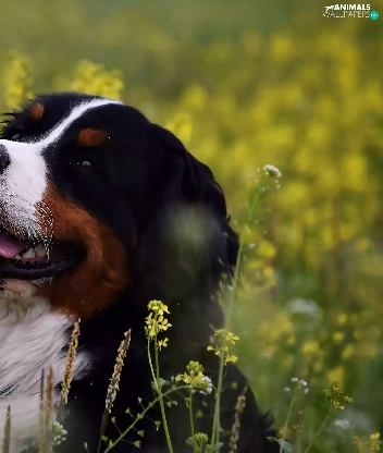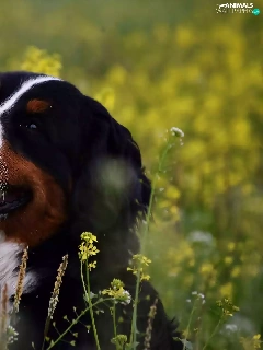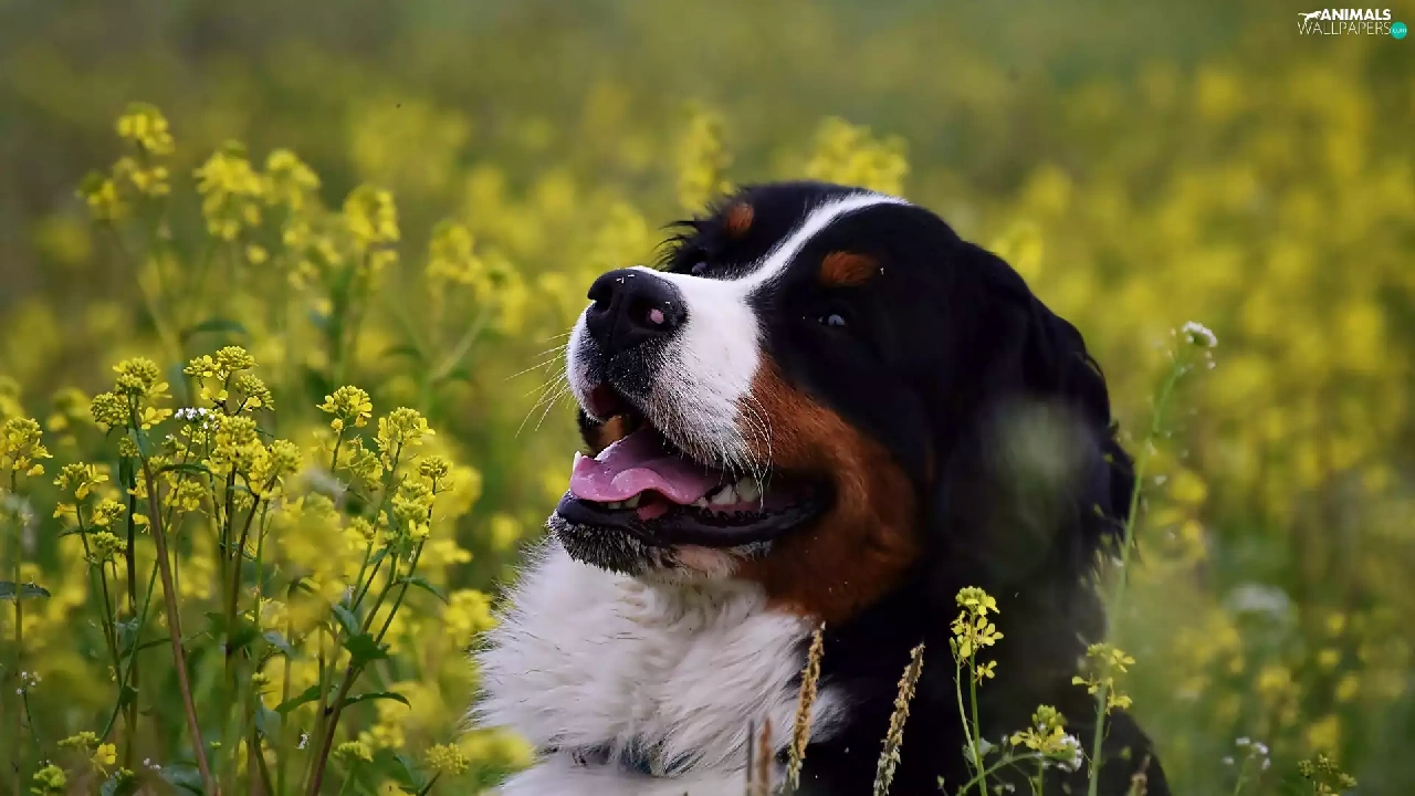 dog, Flowers, rape, Yellow