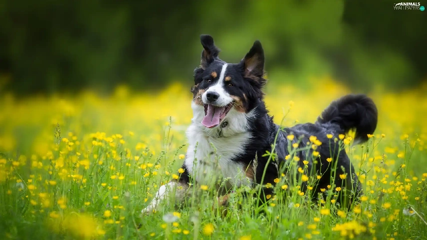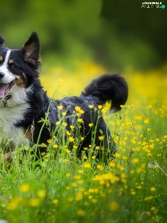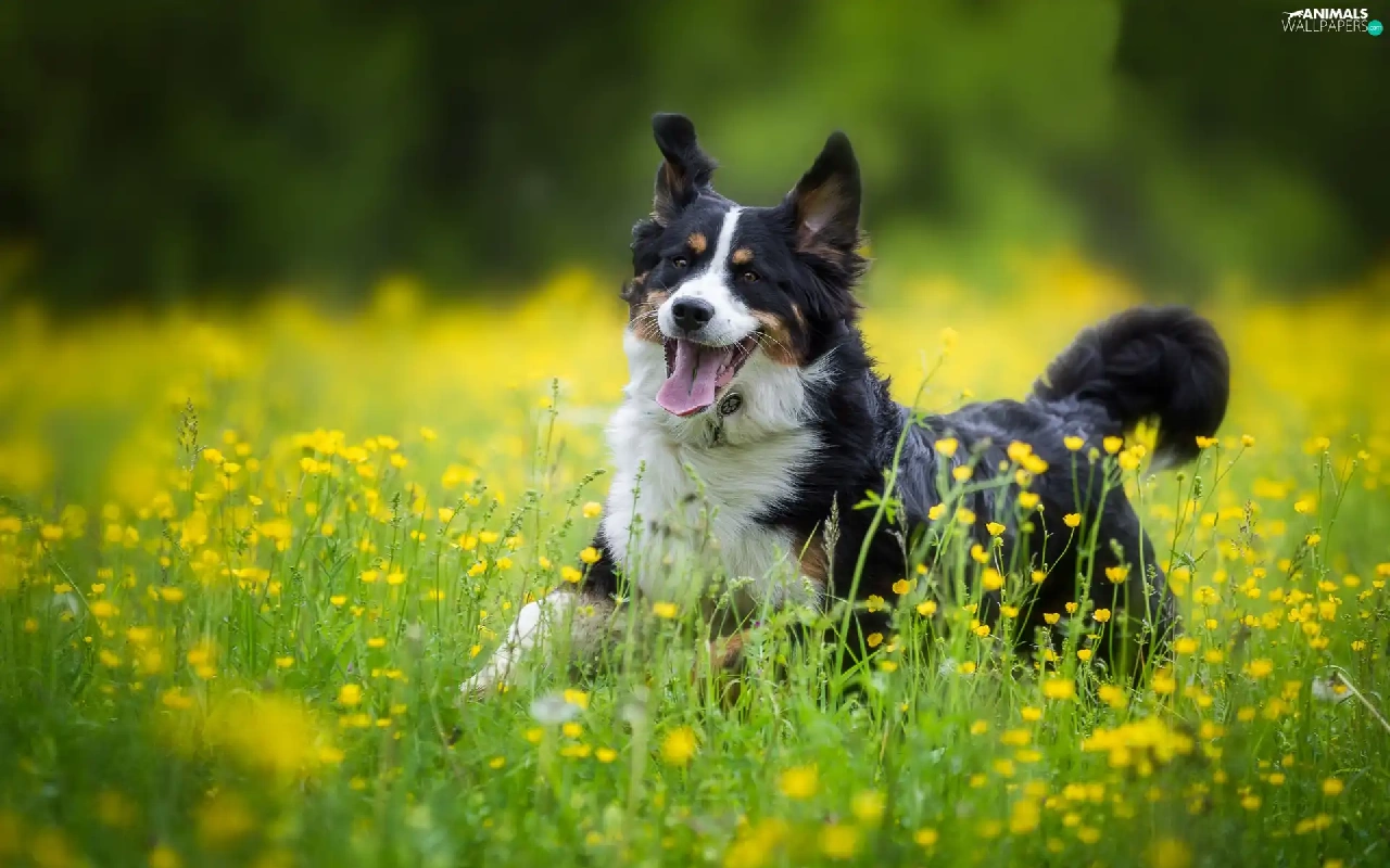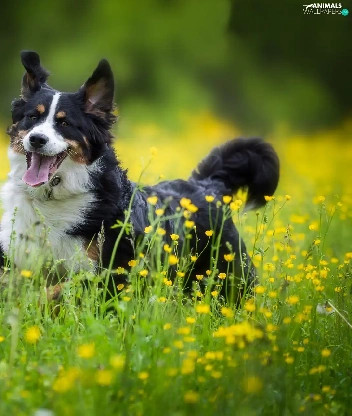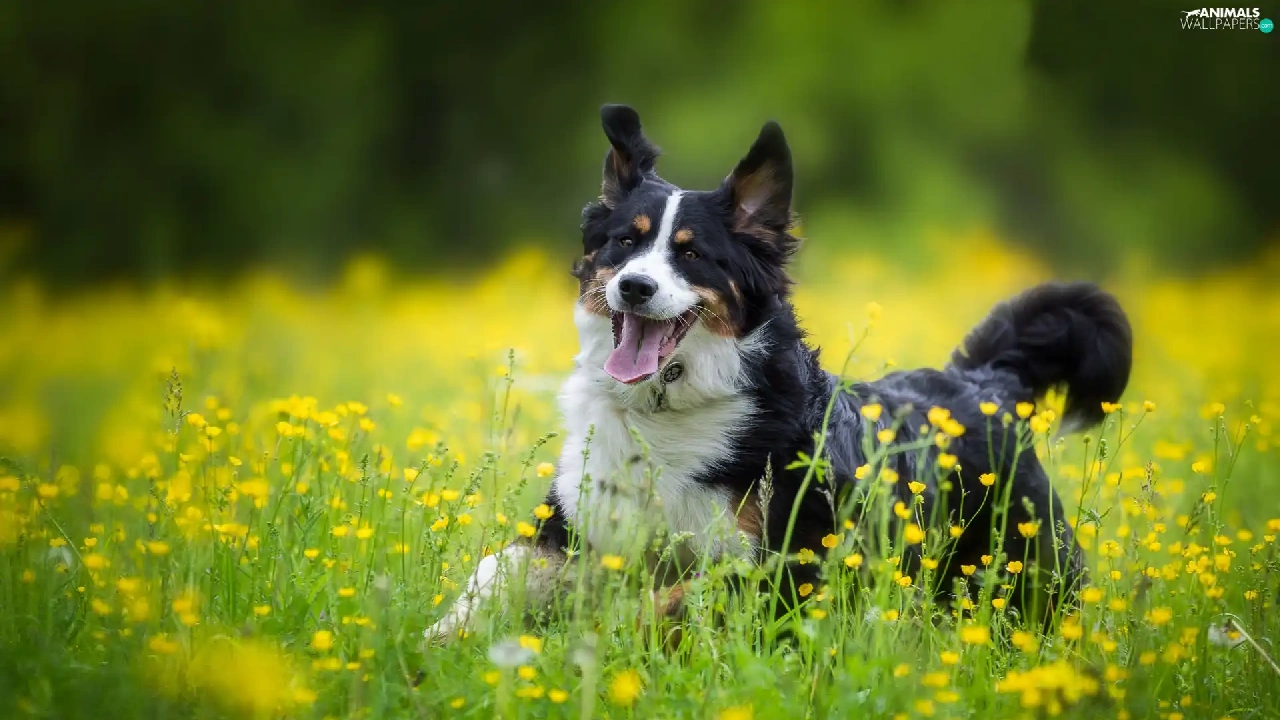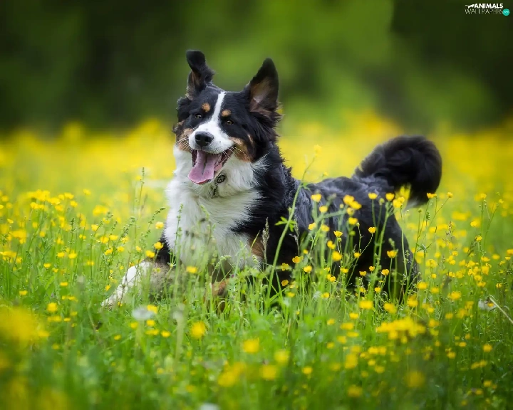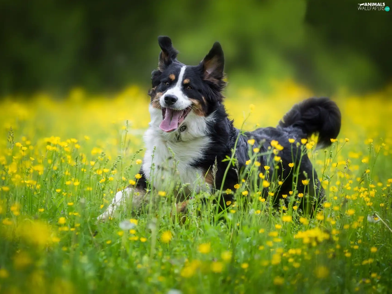 Bernese Mountain Dog, Yellow, Flowers, Meadow