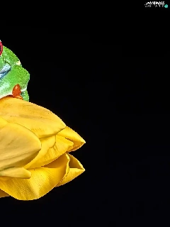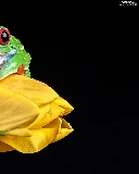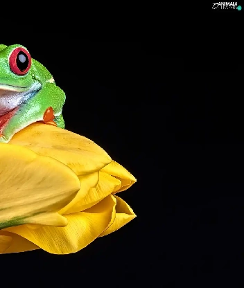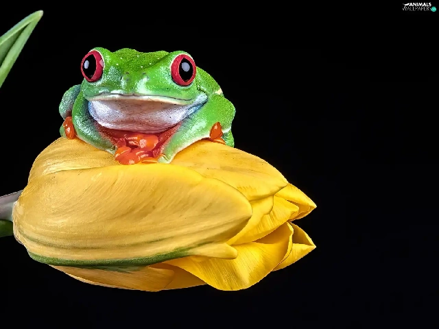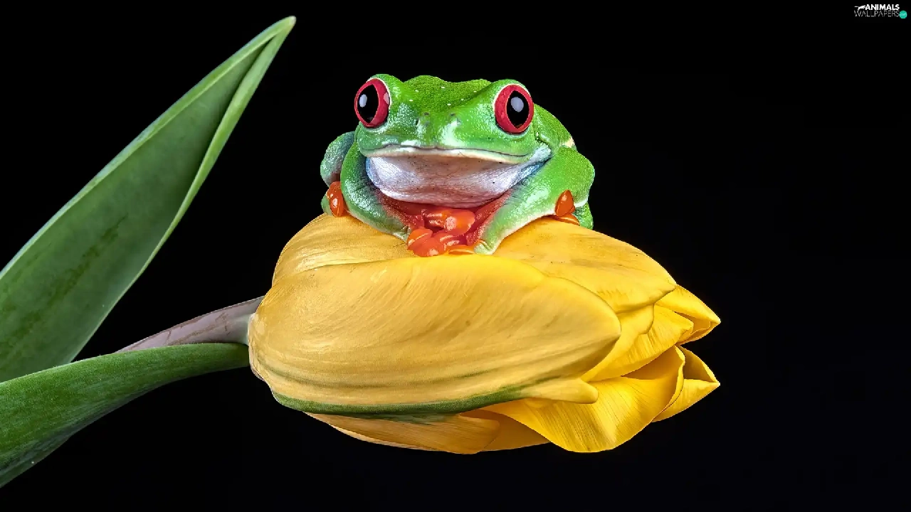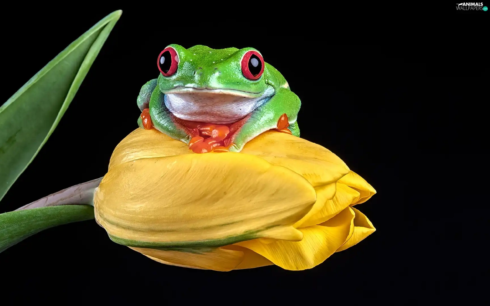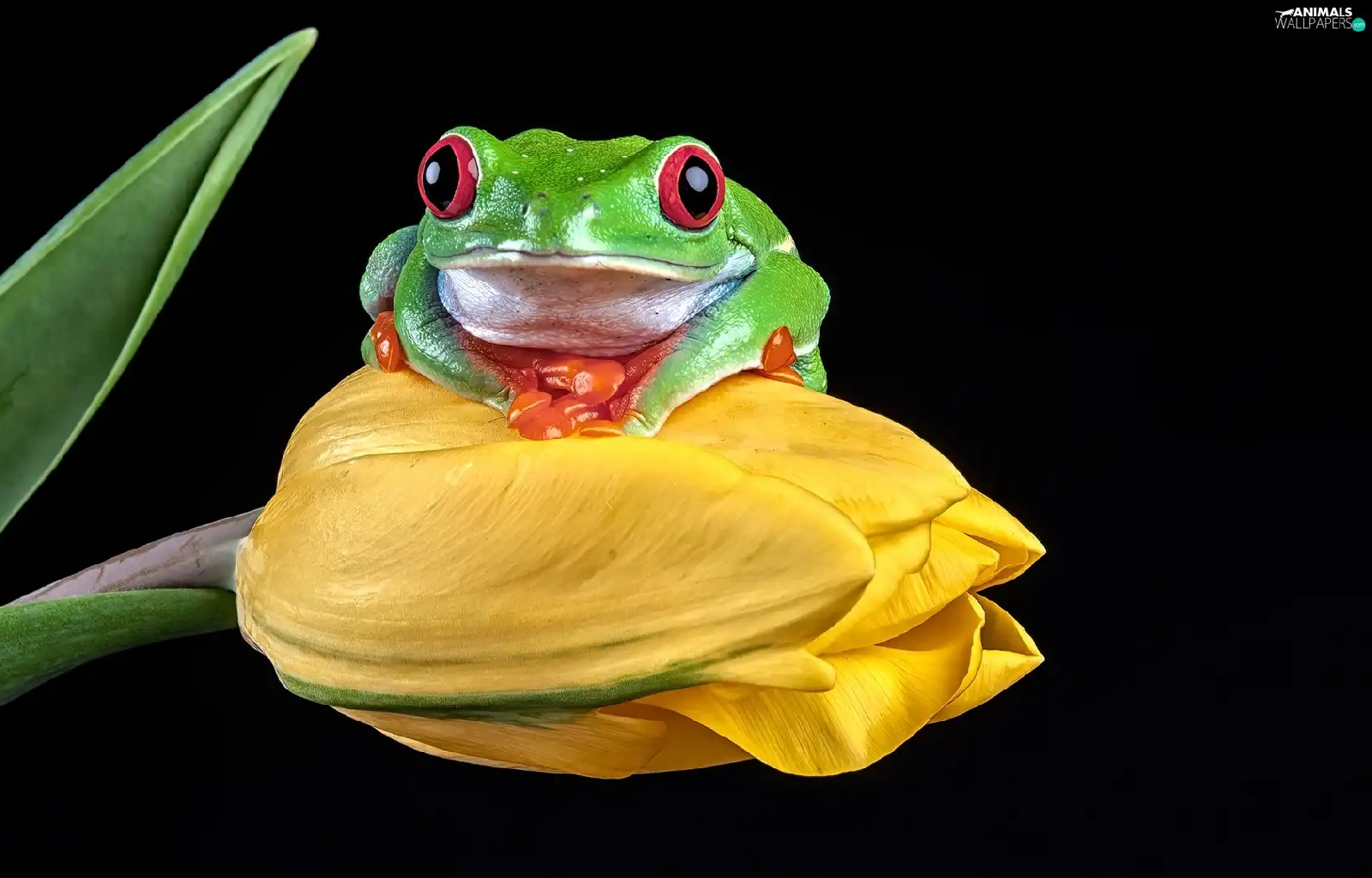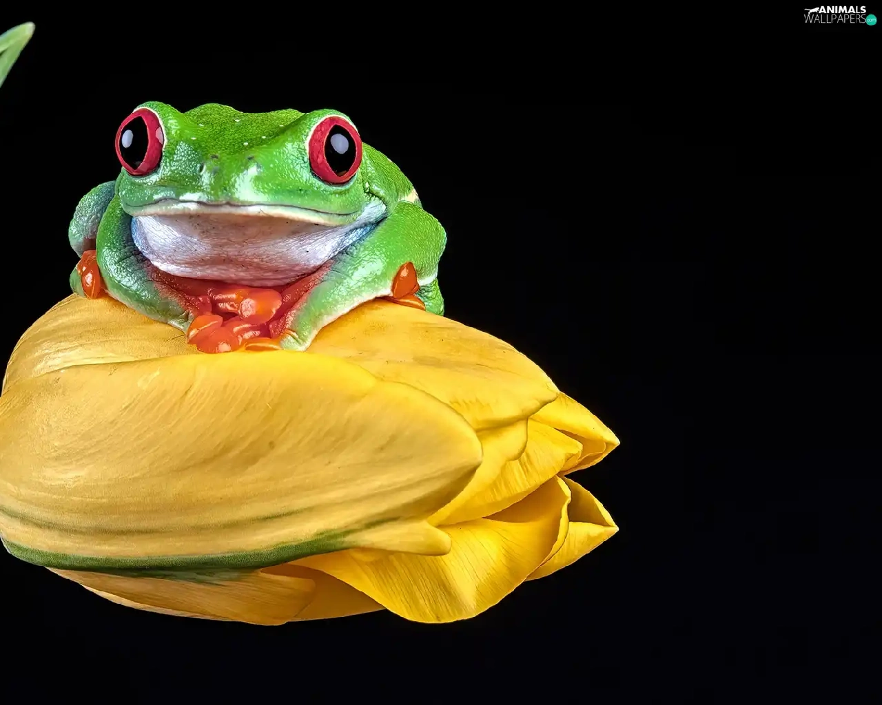 Yellow, strange frog, dark, background, tulip, Red eyed tree frog