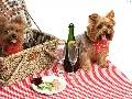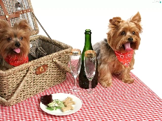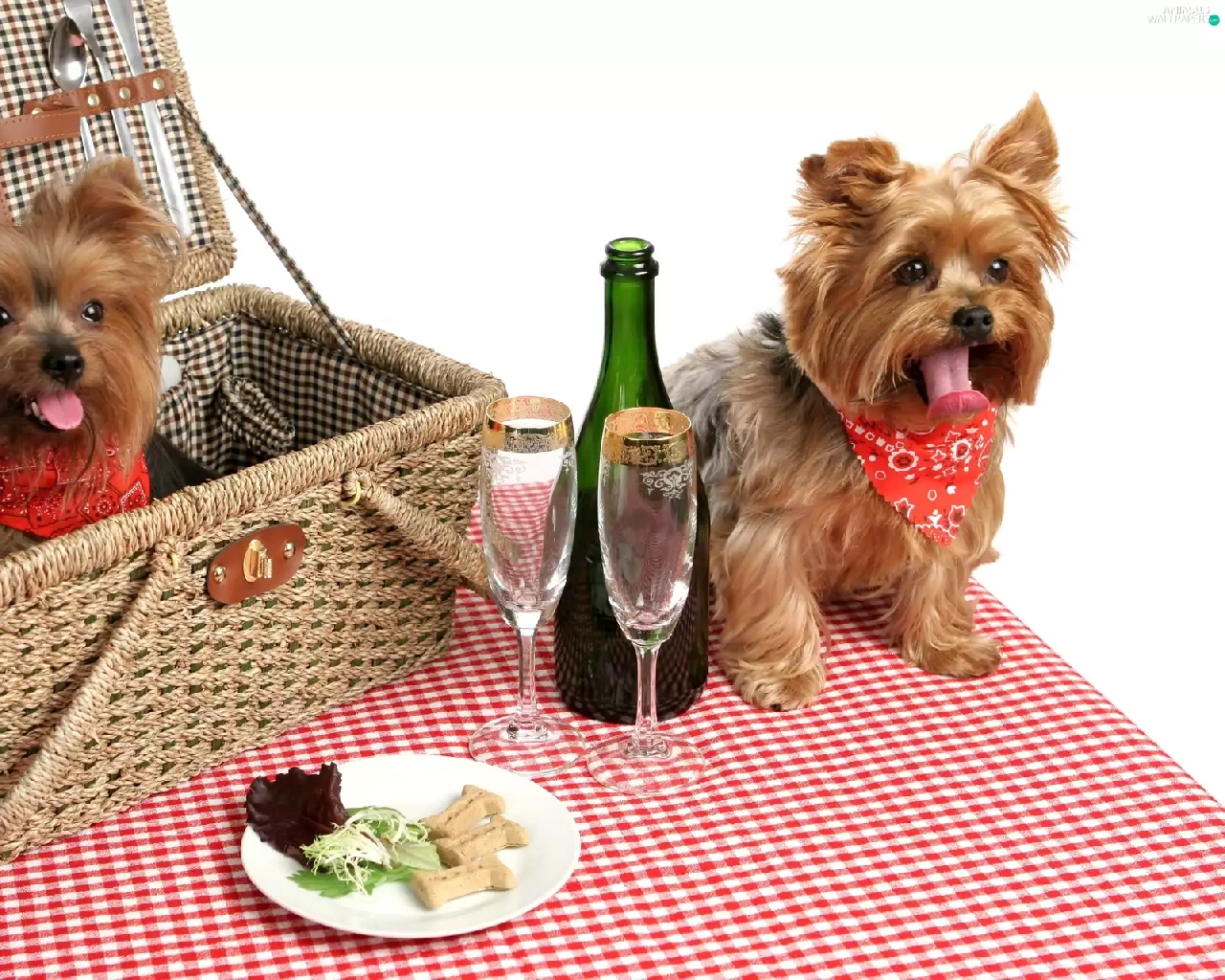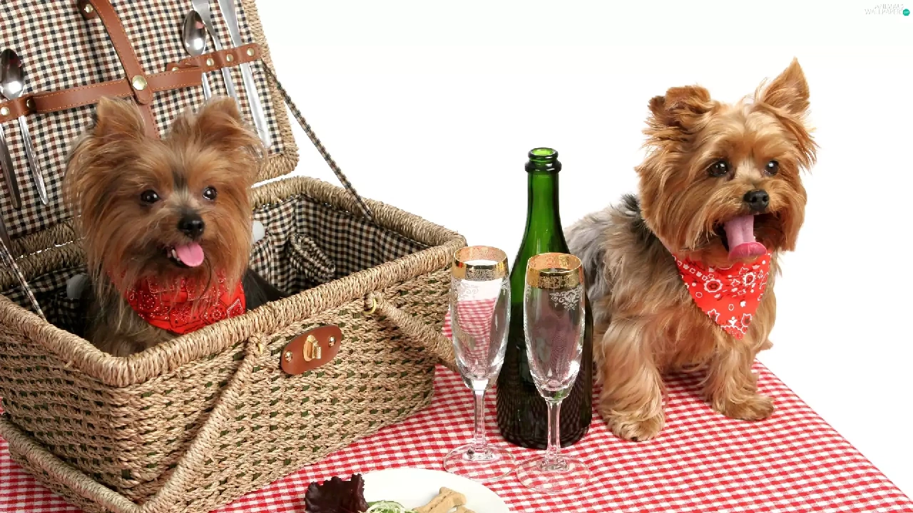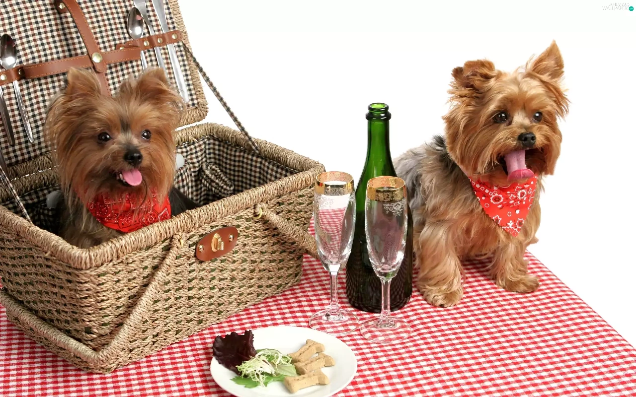 basket, picnic, puppies, Yorkshire Terrier, Two cars