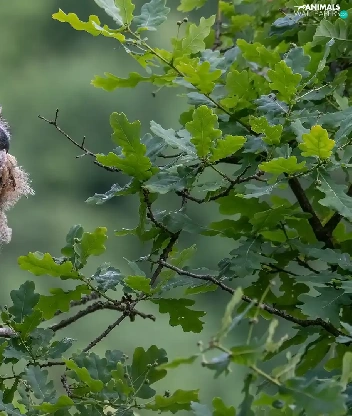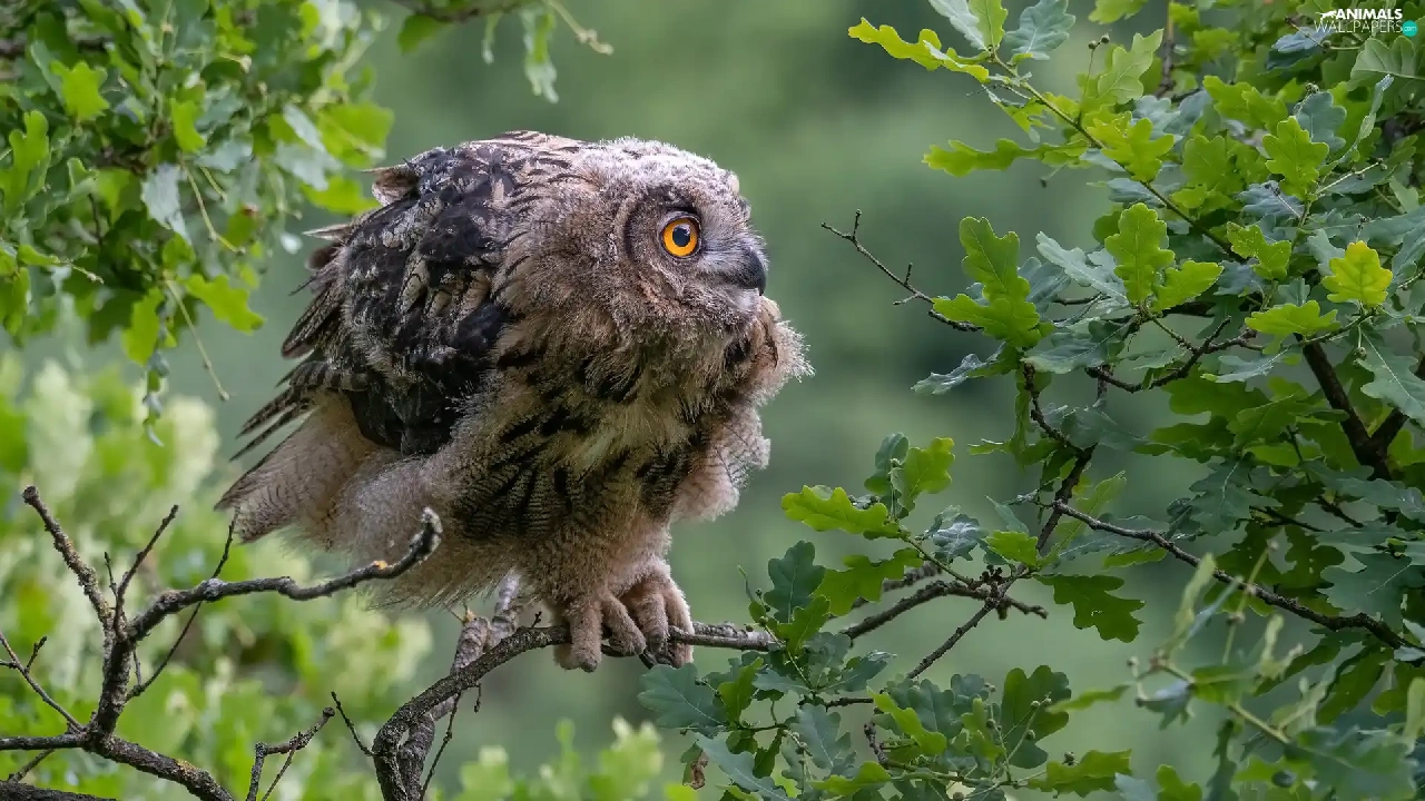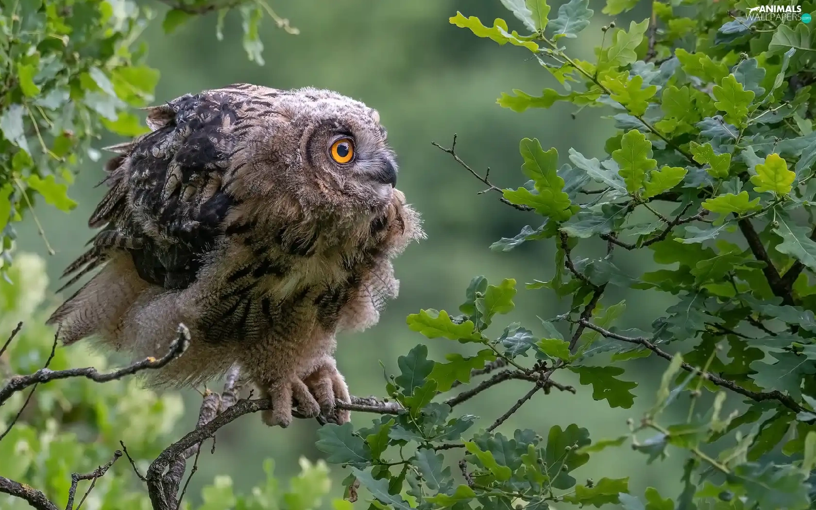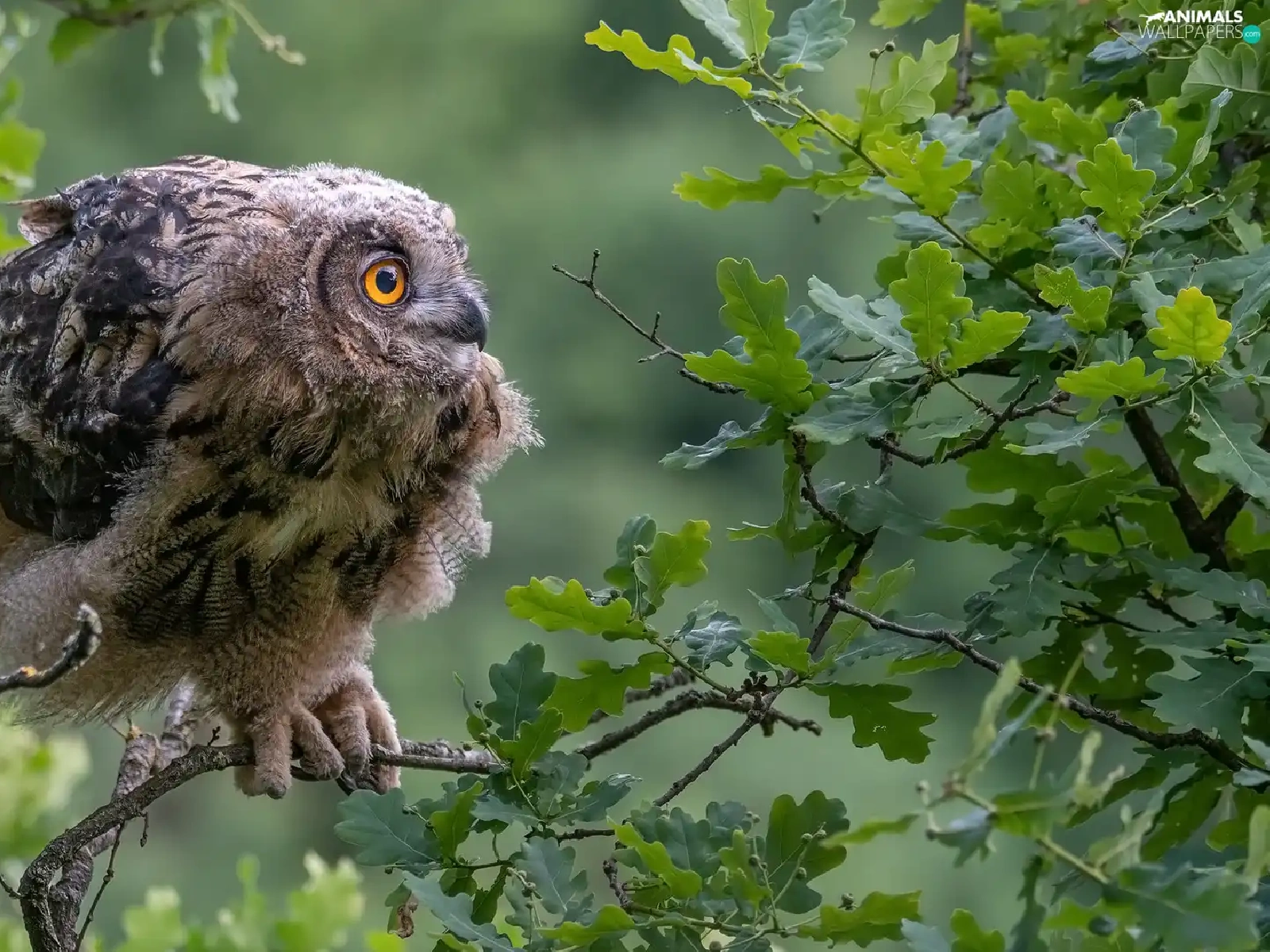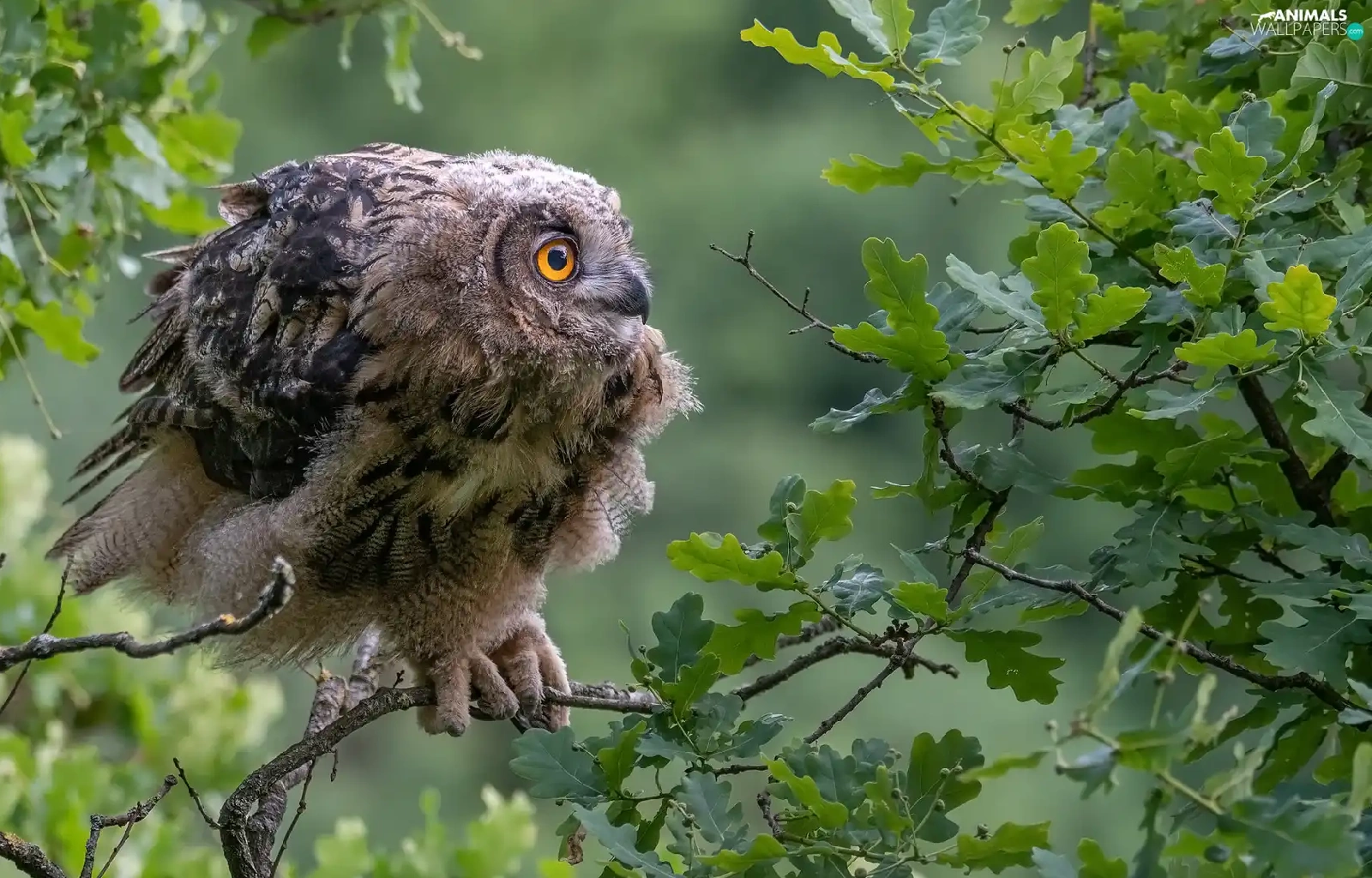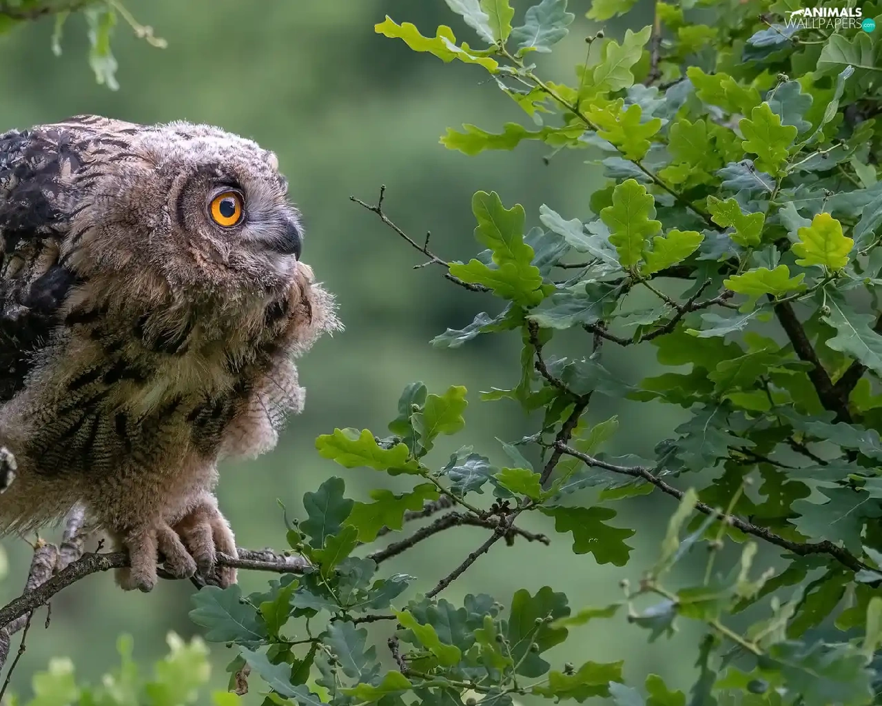Eurasian Eagle-Owl, owl, oak, Leaf, trees, young
