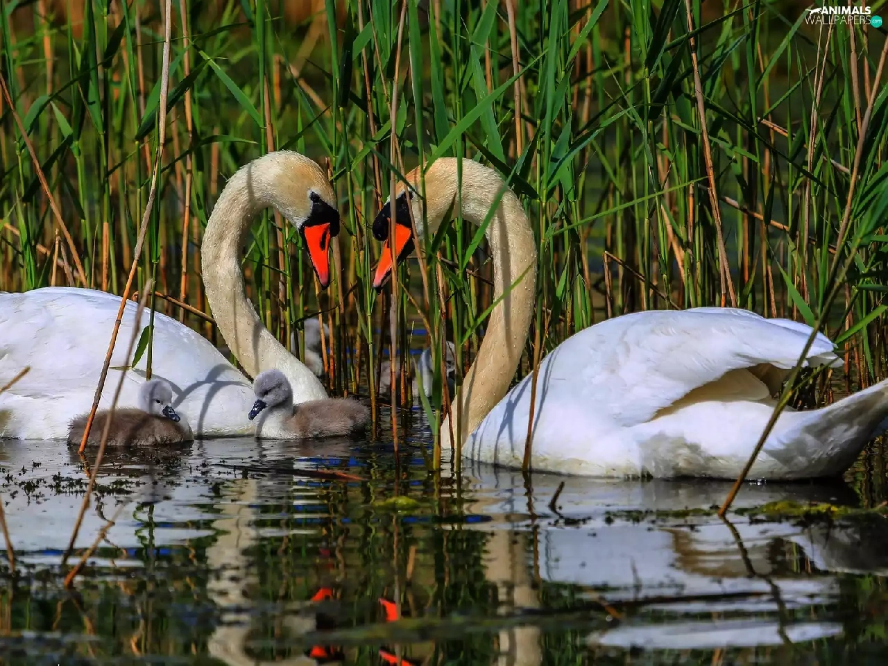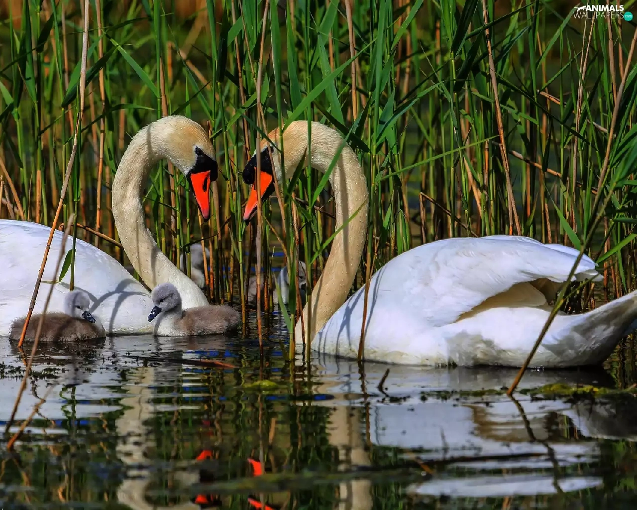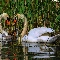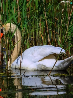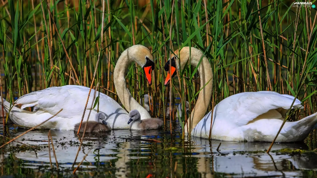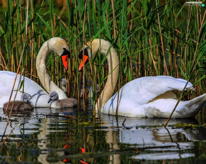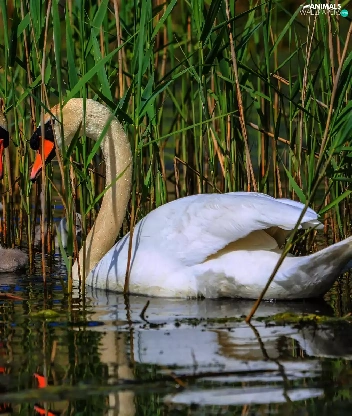 Swan, water, rushes, young