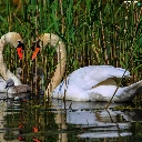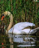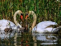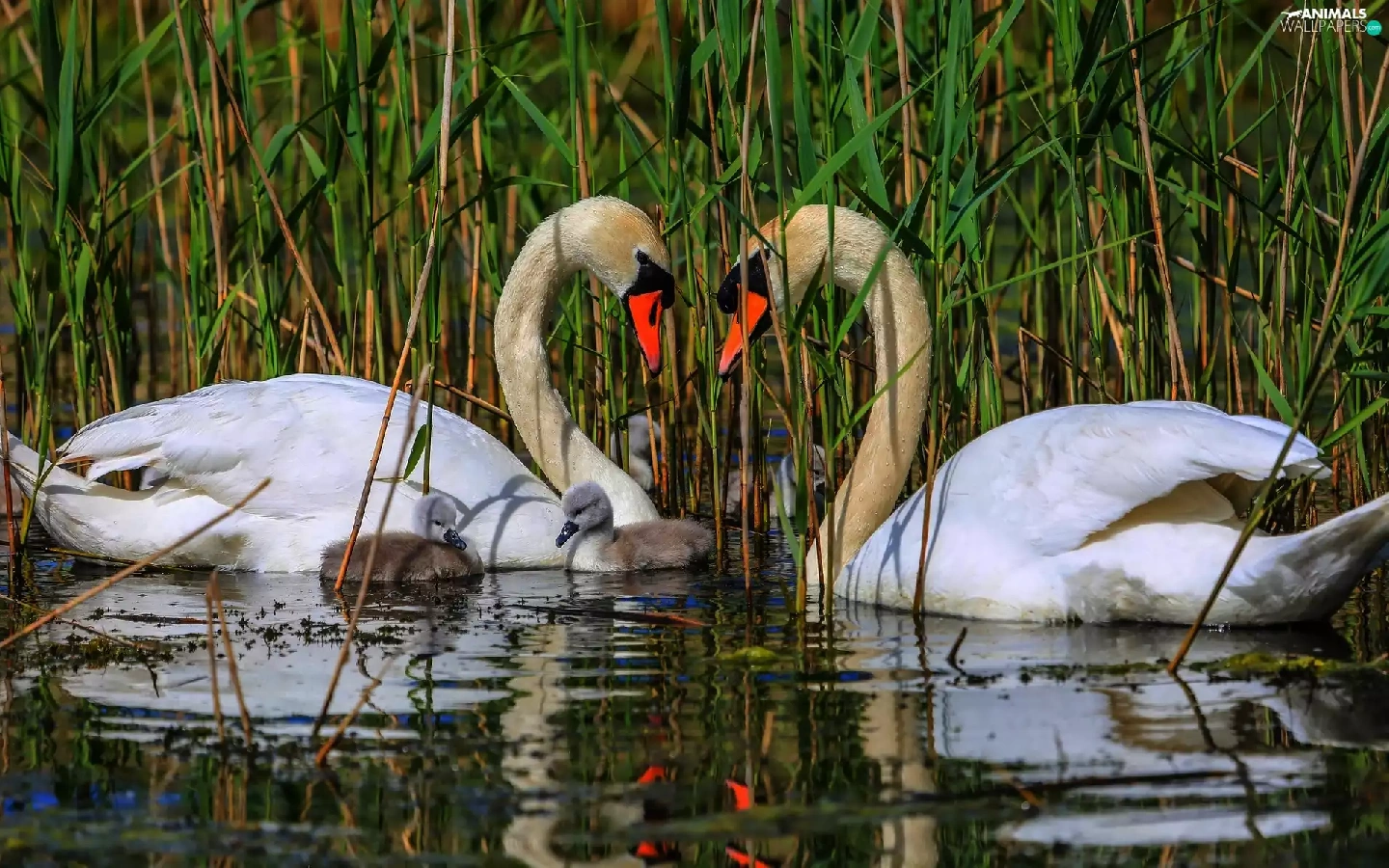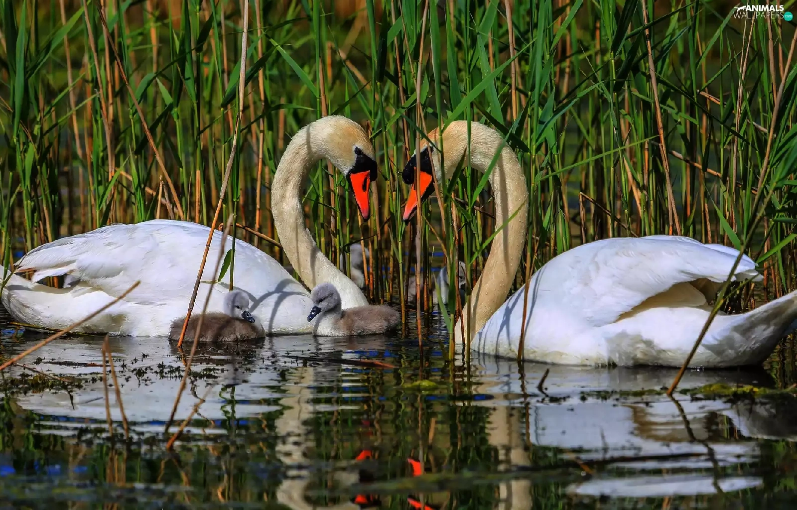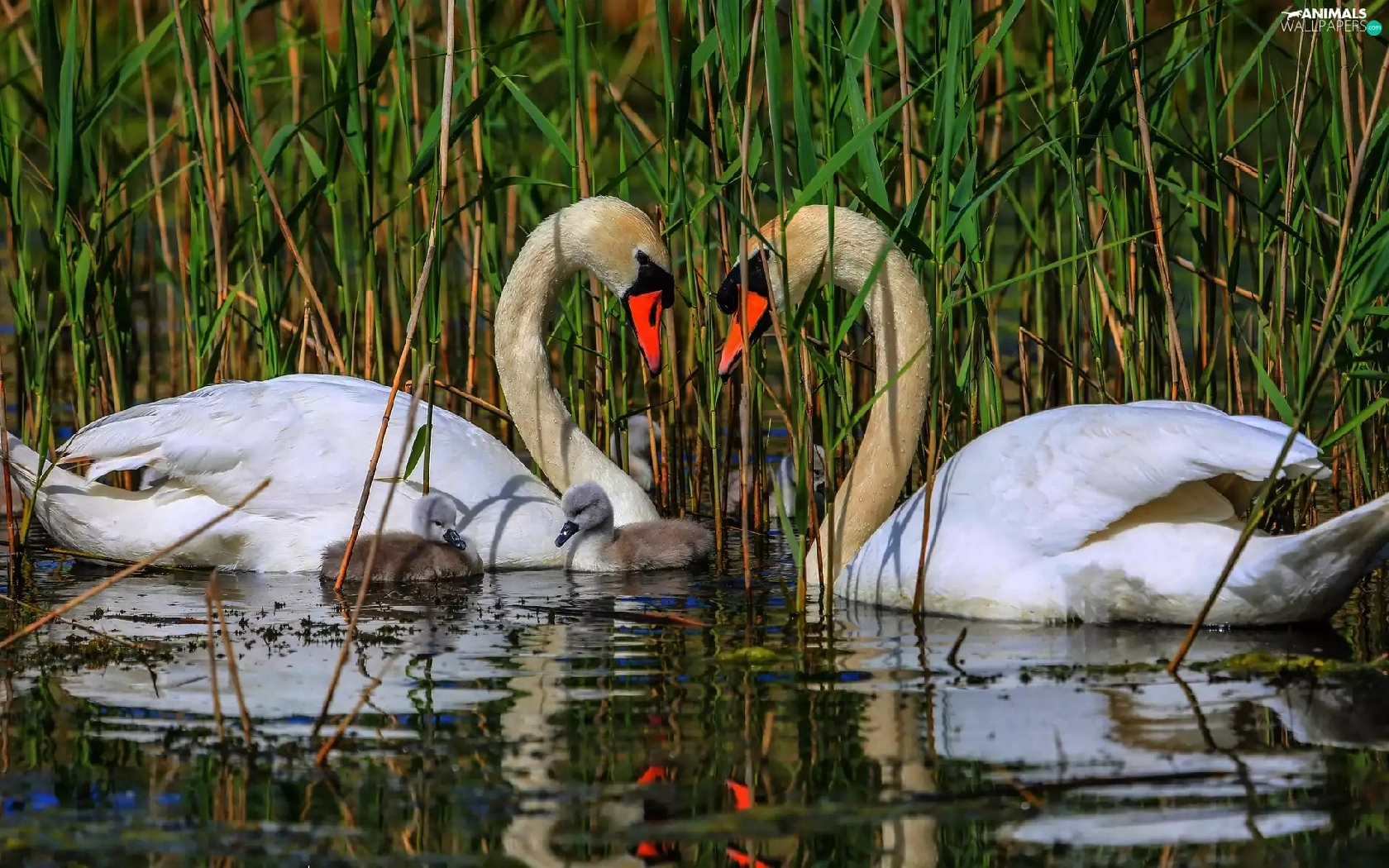 Swan, water, rushes, young
