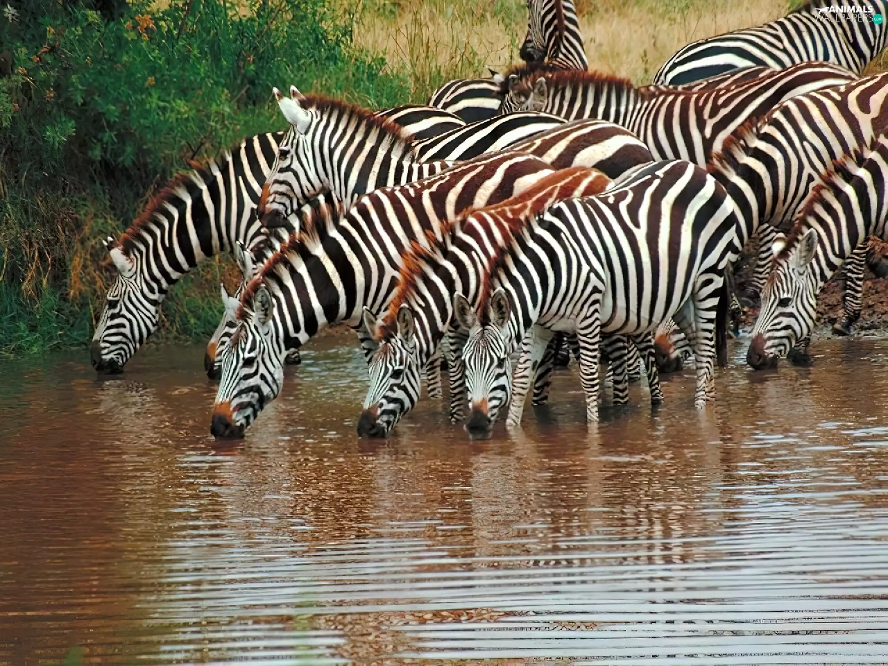 watering place, herd, zebra