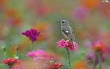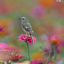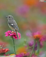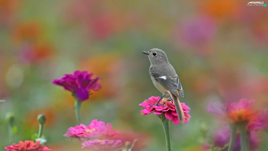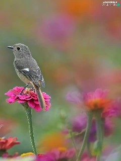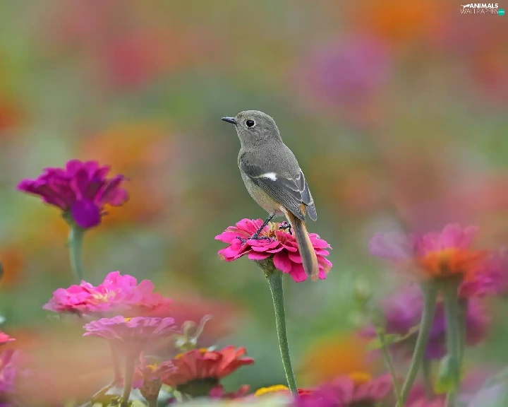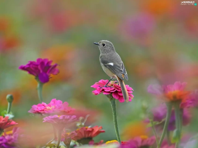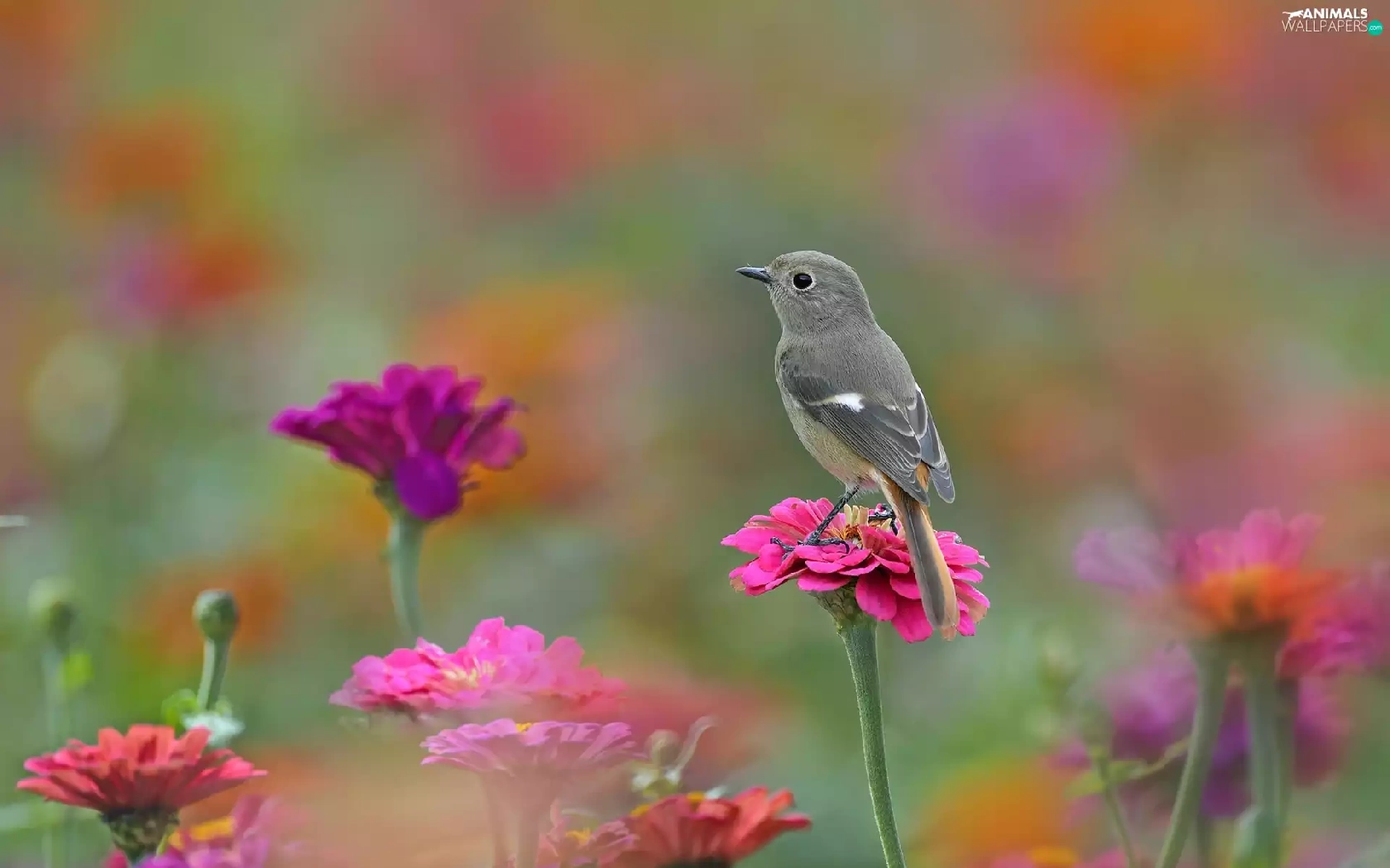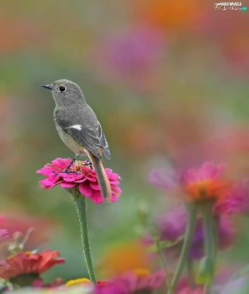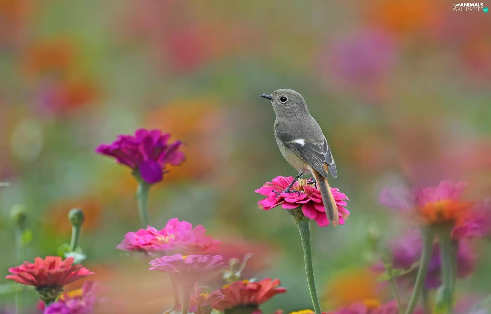 Flowers, Zinnias, female, Redstart Chinese, Bird